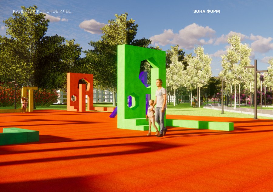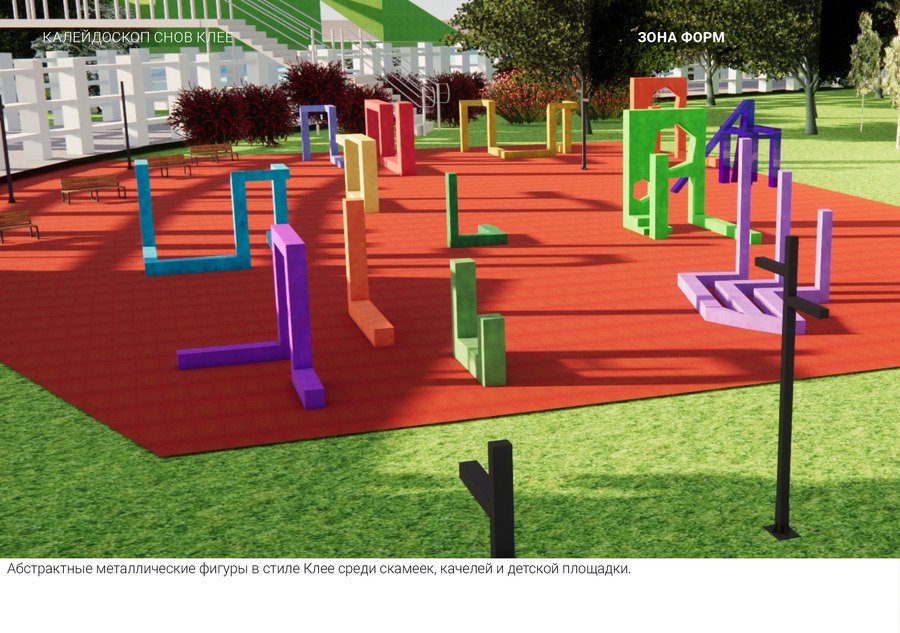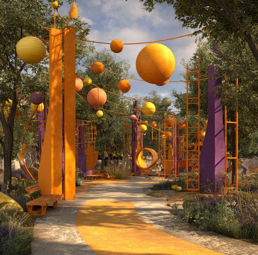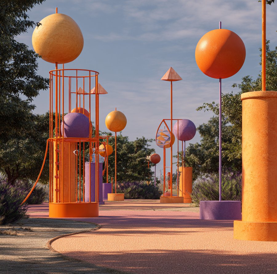 park promt: Create a park named after the artist Paul Klee. A sunny park. A realistic image. Lots of greenery. Unusual art objects in his style. Orange, purple, and yellow colors. Stone paths. Lanterns. A bright playground.