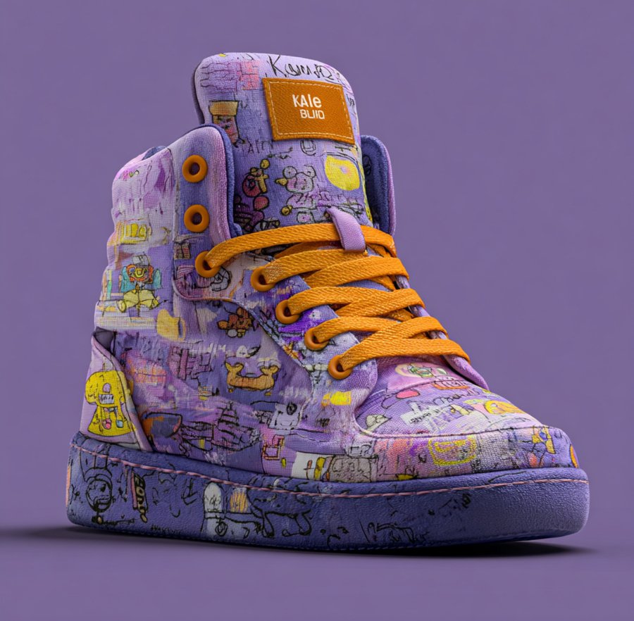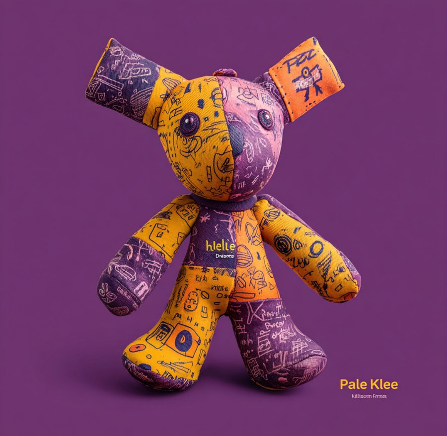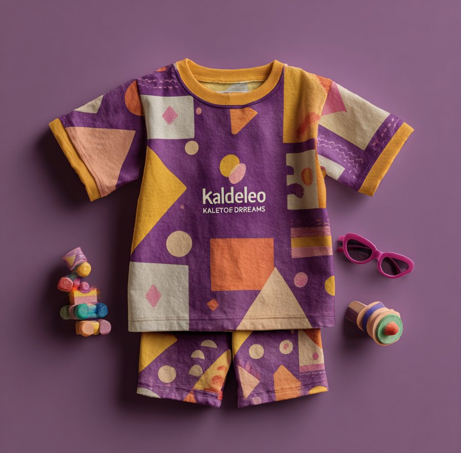 Promt: Create a mockup of the artist Paul Klee’s clothing and apply a logo called «Kaleidoscope of Dreams» to it. Realistic image style. Children’s toys on the clothing. Purple, yellow, and orange colors. Children’s style. The pattern on the clothing resembles a children’s drawing.