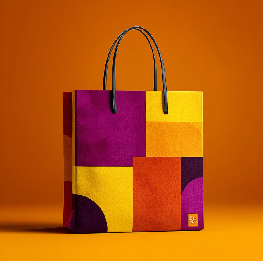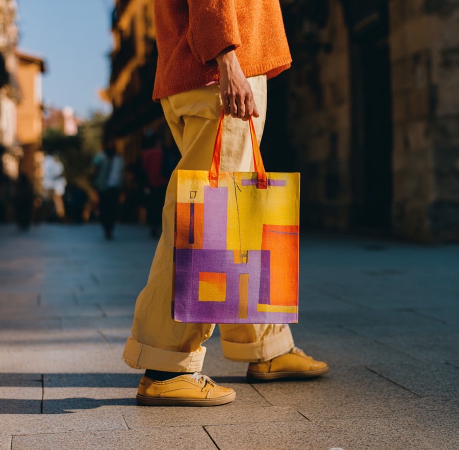 Promt: Create a person walking down the street holding a Paul Klee product bag in yellow, purple, and orange.