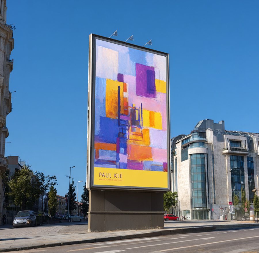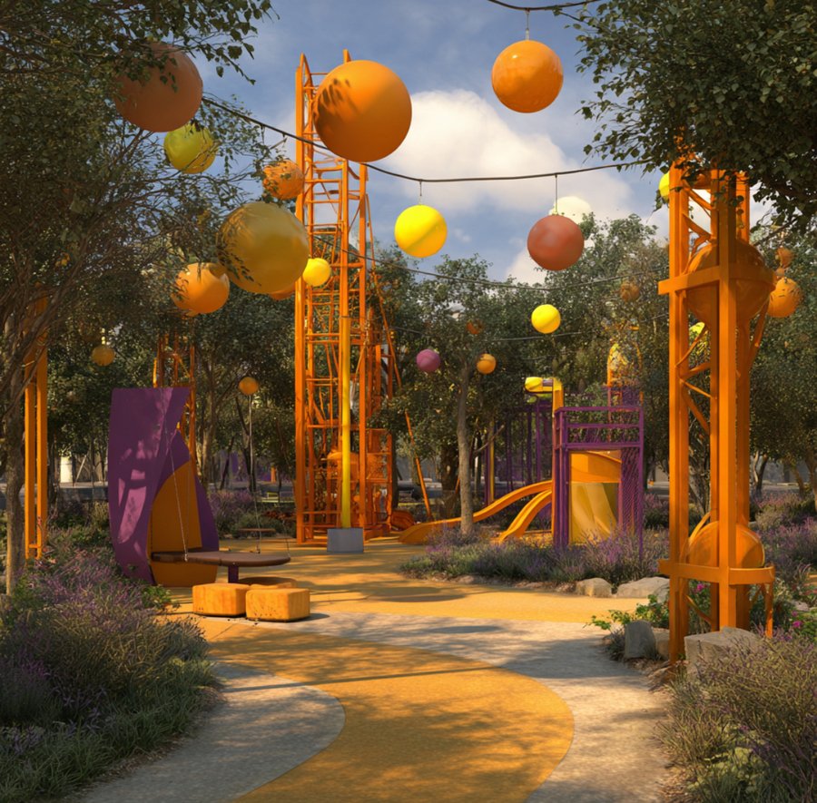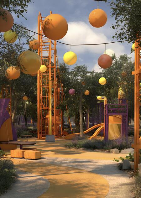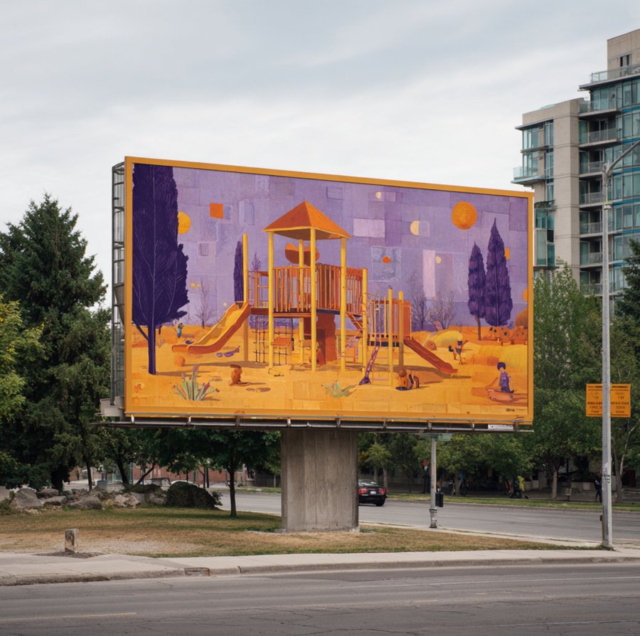 Promt: Create a poster for Paul Klee Park featuring a children’s playground. The realistic image is displayed on a huge advertising banner in the city. Yellow, purple, orange.