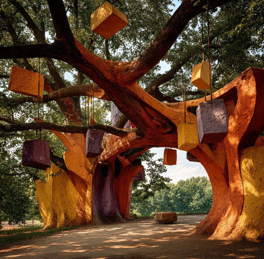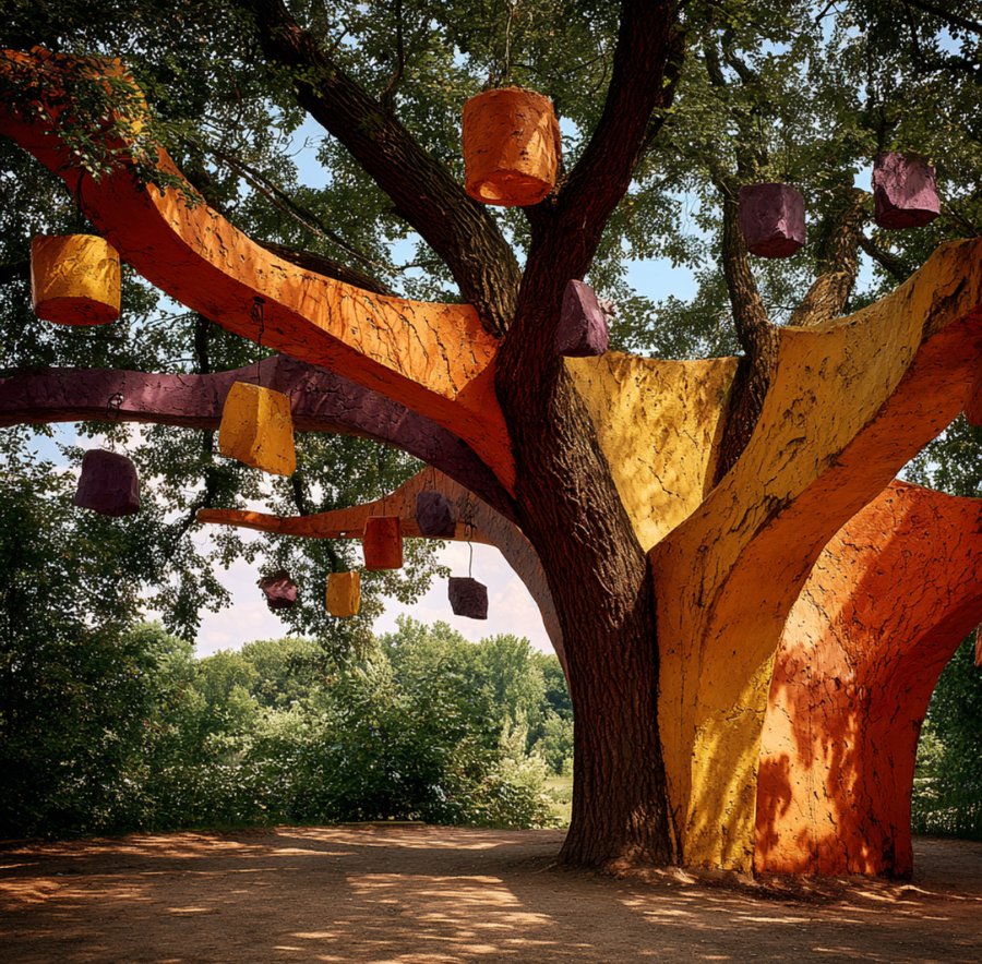 Promt tree: Create a huge tree in Paul Klee’s park with hanging shapes that stay on its branches, in orange, purple, and yellow colors, to create a very realistic image and a sunny day.