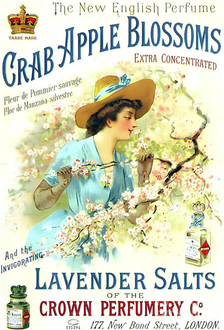 В плакатах, указанных ниже, можно заметить легкую, радостную, с румянцем на лице молодую женщину, вдыхающую аромат цветов или только сорвавших их где-то в саду, в сочетании с нежными постельными оттенками, что всецело создает то настроение и предполагаемые ноты аромата. Несмотря на то, что модерн уже активно проявляется в графике, в данных рекламных плакатах все еще присутствуют отголоски викторианской эпохи. Модерн в рекламе данного вида продукта только начинает набирать обороты. Говоря о женском образе, здесь, как было упомянуто выше, Франция диктовала каноны модных тенденций в женском образе, что оказывало непосредственное влияние на другие страны. Женщины, наконец, могли позволить себе платья более свободного кроя, где талия могла подчеркиваться лентой. Фигура песочных часов, с ярко выраженными бедрами и грудной клеткой имеет свой акцент на данном плакате.
