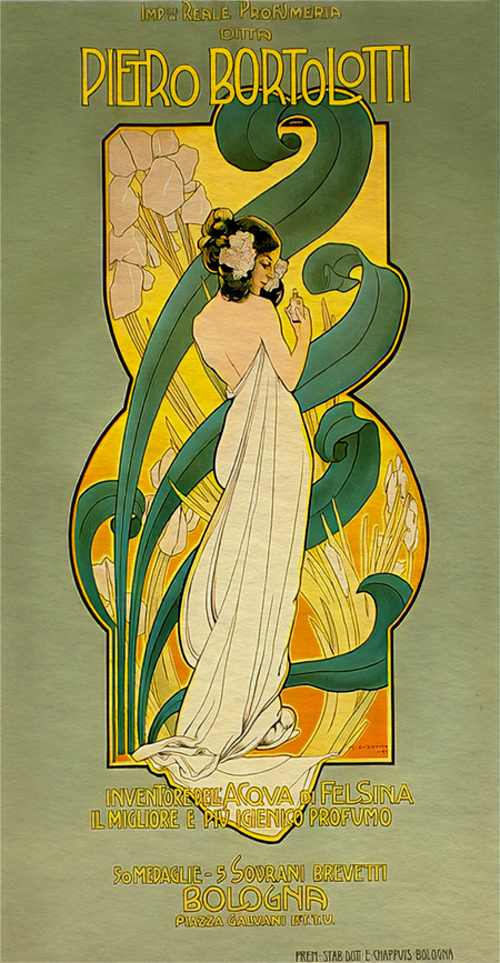 Леопольдо Метликовитц, последователь итальянского модерна, в рекламных плакатах духов вовсе отказался от какой-либо одежды для максимальной передачи чувствования аромата. Обнаженные, но при этом не пошлые и не вульгарные женские тела изображены естественно и непринужденно, без нереально узких талий и пышных грудей. На первой работе девушка словно вышла из воды (парфюмерной, безусловно), излучающая свежесть, на которую слетаются бабочки. А открытая шея, зона декольте, где концентрируется парфюм, еще с большей силой усиливает этот бриз аромата через плакат. Особенно впечатляет следующая работа Леопольда, а именно насколько динамично он передает прозрачную еле уловимую вуаль, которая аккуратно и очень бережно покрывает девушку. Эта вуаль аромата словно возвысила ее над закатным городом в огнях вечера. Девушка стала бабочкой, окрыленной, легкой, оставляющей после себя этот чарующий след, охватывающий все вокруг.