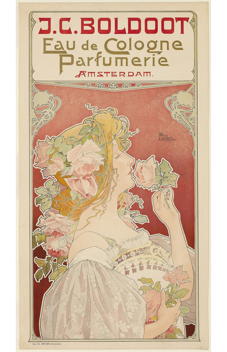 Невозможно не отметить работы одного из самых ярких представителей модерна — Альфонса Мухи. У Мухи существует довольно обширная серия девушек, изображенных в полный рост для разных продуктовых реклам. В данных парфюмерных плакатах можно вновь наблюдать все яркие элементы ар-нуво: графичность контуров, утонченность женского образа, растительные мотивы, цветочные орнаменты и плавность линий. Также Альфонс передает динамику с помощью выходящей за рамки части одежды, словно эта мифическая нимфа идет навстречу к нам. На первом плакате девушка окружена прозрачной вуалью аромата, который ведет нас к цветочным орнаментам для передачи ассоциативного ряда.