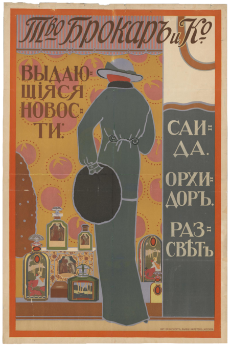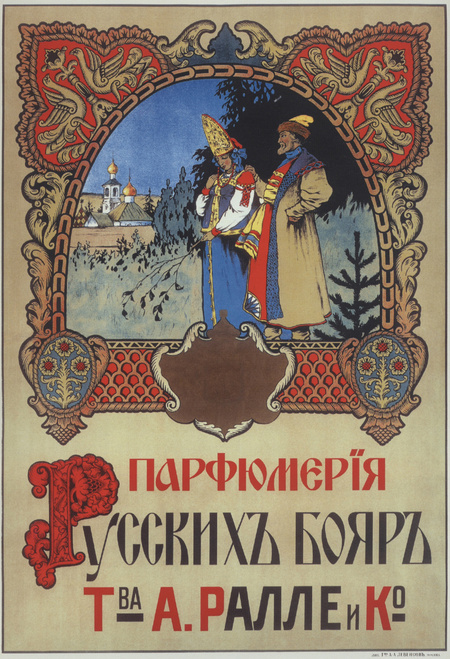 Хочется особенно выделить российские социокультурные парфюмерные плакаты. Говоря про модерн в России, то он развивался довольно нелинейно и своеобразно, собрав в себе и возродив русские фольклорные мотивы. Стоит упомянуть, что первые крупные парфюмерные фабрики в России были основаны самими французами. Стоило бы предположить, что и реклама будет в стилистике ар-нуво, подобной Альфонсу Мухе. Но цель рекламы, продающей духи российского производства имела цель показать, что наш отечественный продукт ничем не уступает импортному, в частности, как бы парадоксально это не звучало, а именно французским конкурентам.
