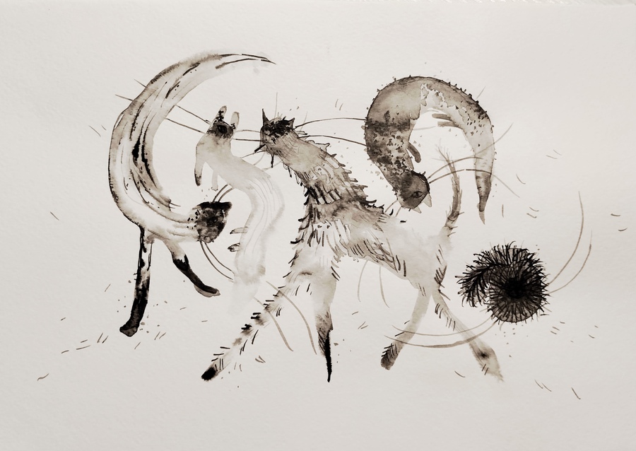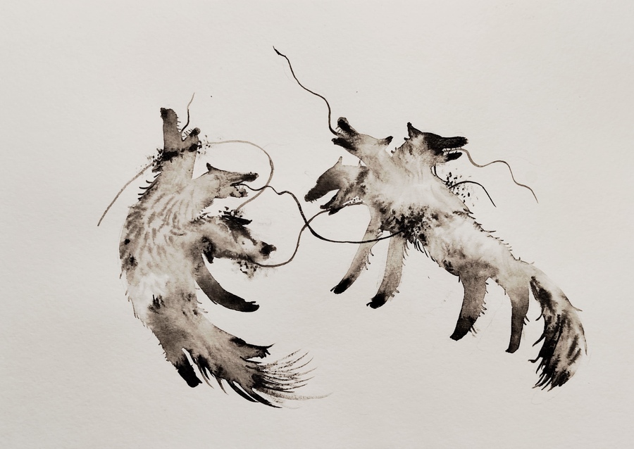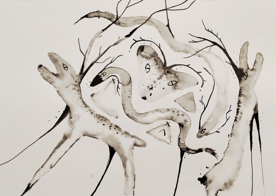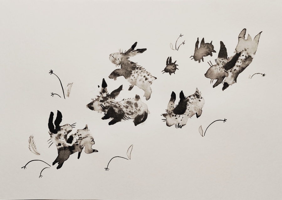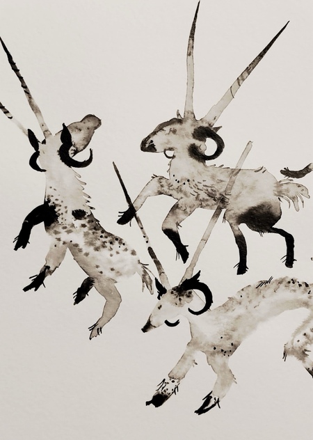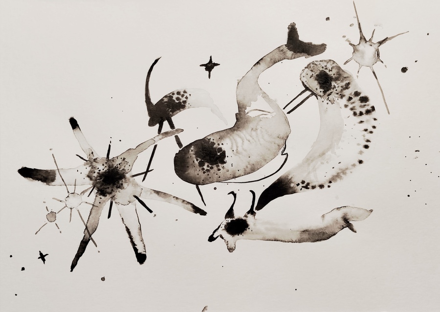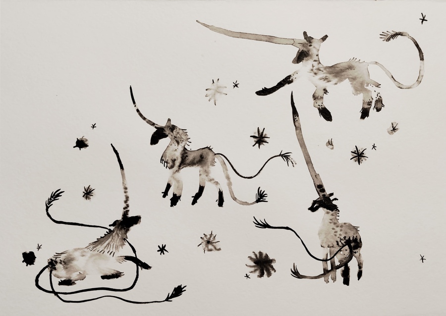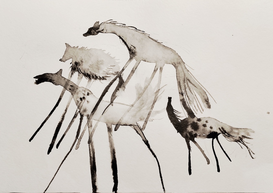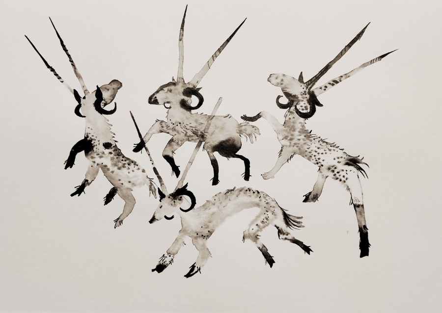 В серии «Поток зверей» я попробовала исследовать изображение и характер чудаковатых животных. Звери здесь не изображены буквально — они возникают как тени, как воспоминания о встрече с чем-то живым. Тушь и вода позволили создавать мягкие переходы и расплывчатые пятна, через которые проступает образ.