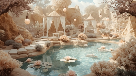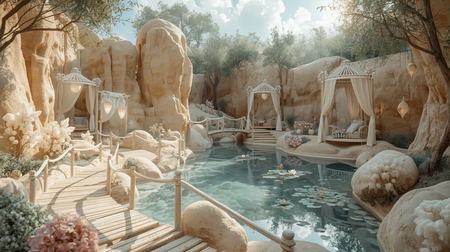Prompt: «A whimsical park in a light, airy fairy-tale style, nestled around a serene, crystal-clear pond surrounded by soft, golden sandstone cliffs. The landscape and structures are crafted from natural, almost weightless materials—pale wood, woven elements, glass, and flowing fabrics. The park features winding pathways, suspended rope bridges, cozy gazebos with billowing sheer curtains, lanterns shaped like fireflies, and fluffy-flowered plants in soft bloom. The water is calm and mirror-like, reflecting the sky and clouds, dotted with silky-petaled water lilies. The entire scene is bathed in gentle sunlight and a delicate haze, evoking a peaceful, dreamlike fairytale atmosphere. The aesthetic is ethereal and fantastical, yet understated—avoiding excessive ornamentation. Color palette: soft pastels—beige, sandy gold, pale sky blue, peach, cream, with subtle accents of lavender and mint.»