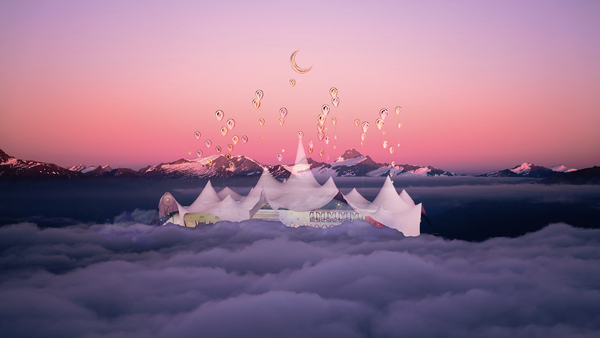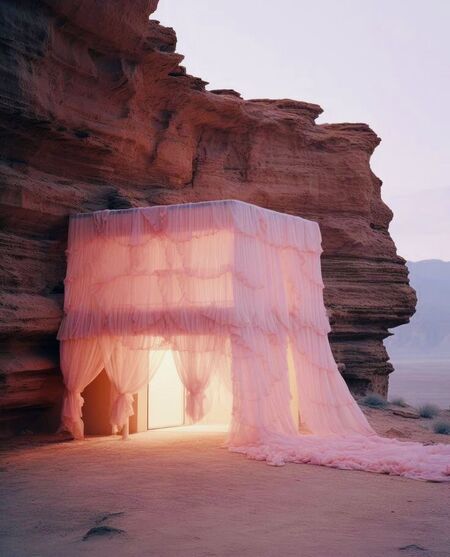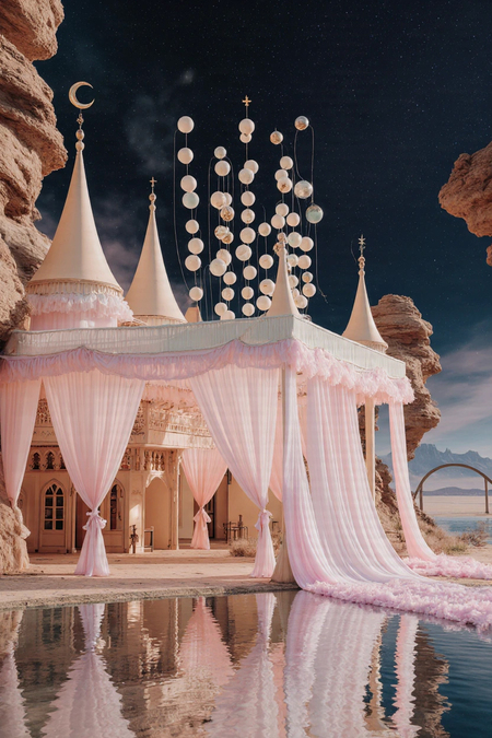 (Видео слева сгенерированно при помощи Krea Ai. Я в качестве промта загрузила рендер своего прошлого проекта + в качестве референса стиля загрузила изображение найденное в интернете, в качестве текстового промта указала «A surreal, dreamlike palace floating on the edge of a calm, mirror-like lake at twilight, nestled between towering sandstone cliffs and otherworldly rock formations. The structure is a whimsical fusion of fantasy architecture and desert romance — soft pastel pink and cream spires crowned with crescent moons and stars, draped in cascading layers of flowing silk curtains in blush and ivory. Delicate hanging ornaments — glowing orbs, celestial baubles, and glass lanterns in pale blue, pink, and pearl — dangle from above like magical constellations.»)