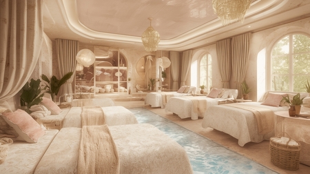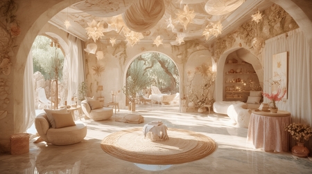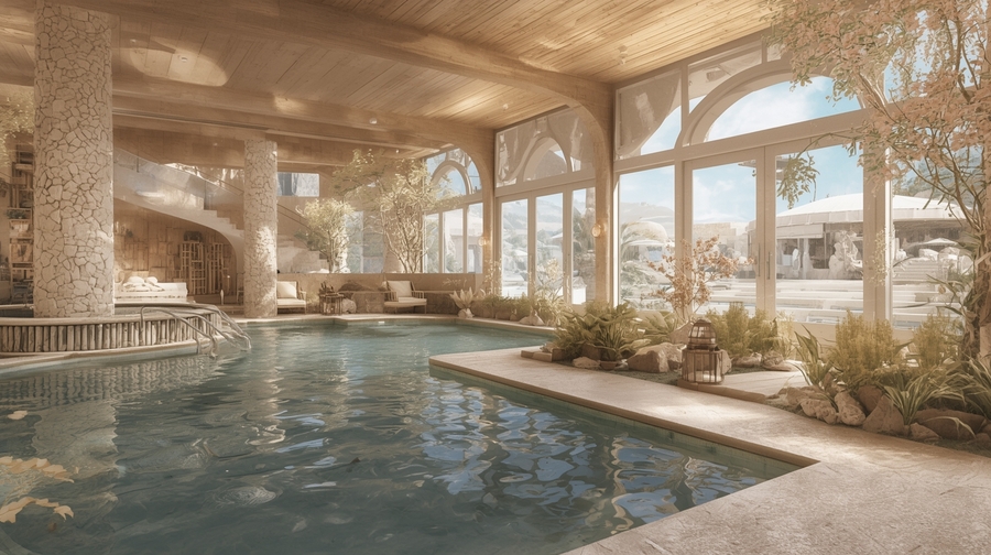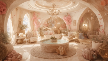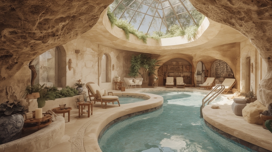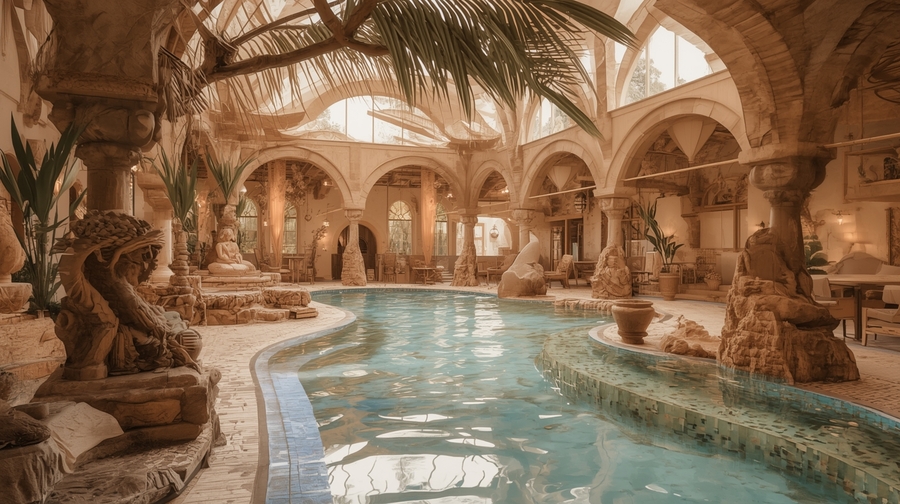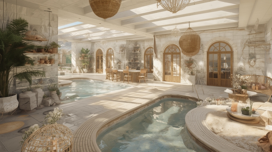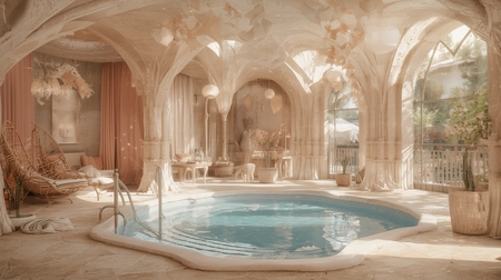 В качестве style transfer я вставила предыдущие изображения горячих источников, а затем попросила в таком же стиле выполнить внутренние интерьеры.