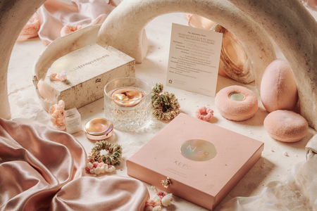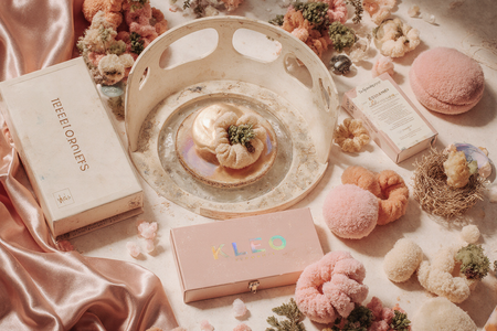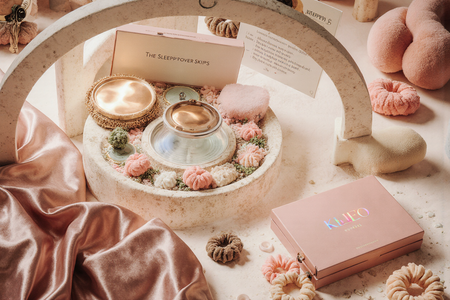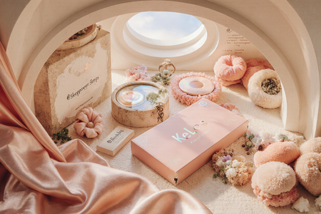 promt: A flat-lay product photography shot of a luxury sleep and beauty collection. The scene features a soft, pastel color palette dominated by blush pink, rose gold, and cream tones. Central to the composition are two open boxes: one labeled «The Sleepower Strips» containing two satin eye masks (one champagne, one rose gold), and another larger box with «Klee» written in iridescent lettering. Surrounding these are various accessories including fluffy pink and brown hair scrunchies, a plush pink eye mask, business cards for «The Sleepower» and «Keepover,» and a silk scarf. The items are arranged artfully on a clean white background, creating a minimalist, elegant, and serene aesthetic perfect for marketing high-end wellness or beauty products.