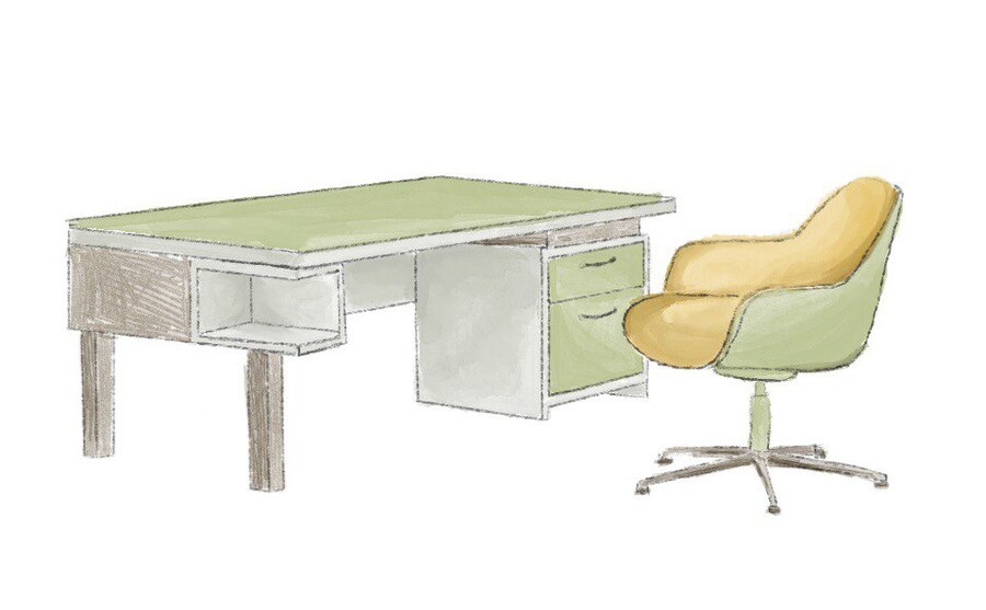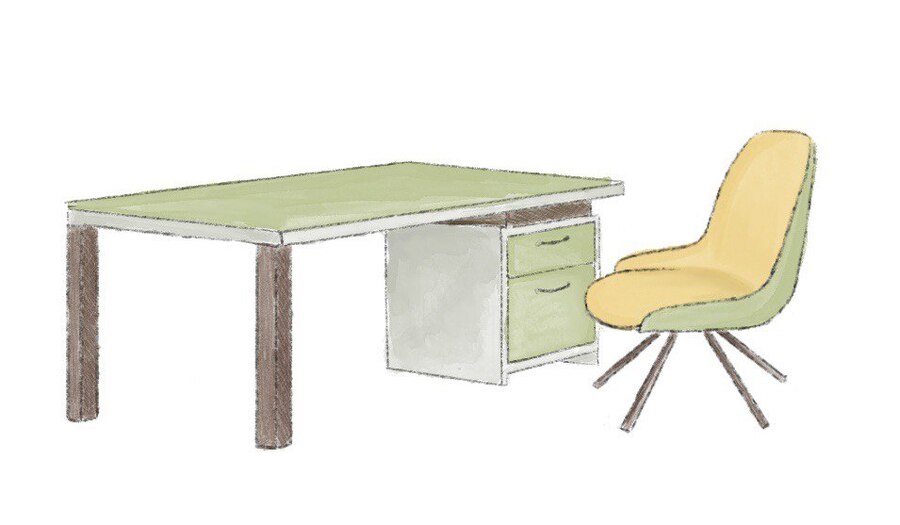 Ламинированный МДФ для столешницы обеспечивает необходимую износостойкость и влагостойкость для рабочих процессов мастерской при доступной стоимости. Экокожа для стула выбрана благодаря простому уходу и устойчивости к истиранию, что соответствует требованиям интенсивного использования в творческом пространстве — мастерской. Цветовая палитра материалов подобрана в соответствии с общей концепцией интерьера мастерской, создавая гармоничную визуальную среду для творчества.