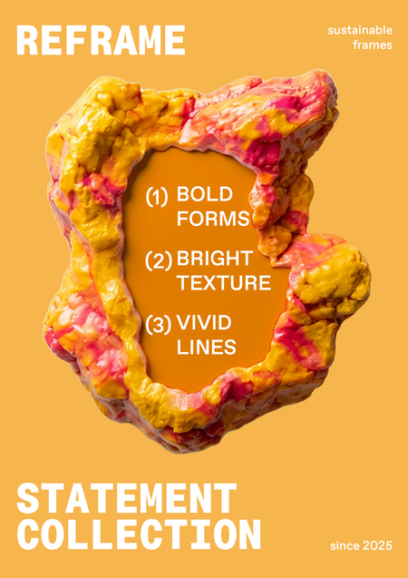 In curatorial practice, the frame influences scale, focus, hierarchy, and the emotional tone of the work. Recycled-plastic frames introduce a specific aesthetic: slightly irregular, tactile, and visibly material. This shifts the viewing experience by: — drawing attention to materiality, — adding context to the artwork, — creating tension between content and display, — encouraging a more conscious reading of the visual image. REFRAME supports the idea that display is part of meaning-making.