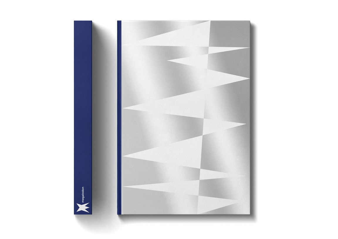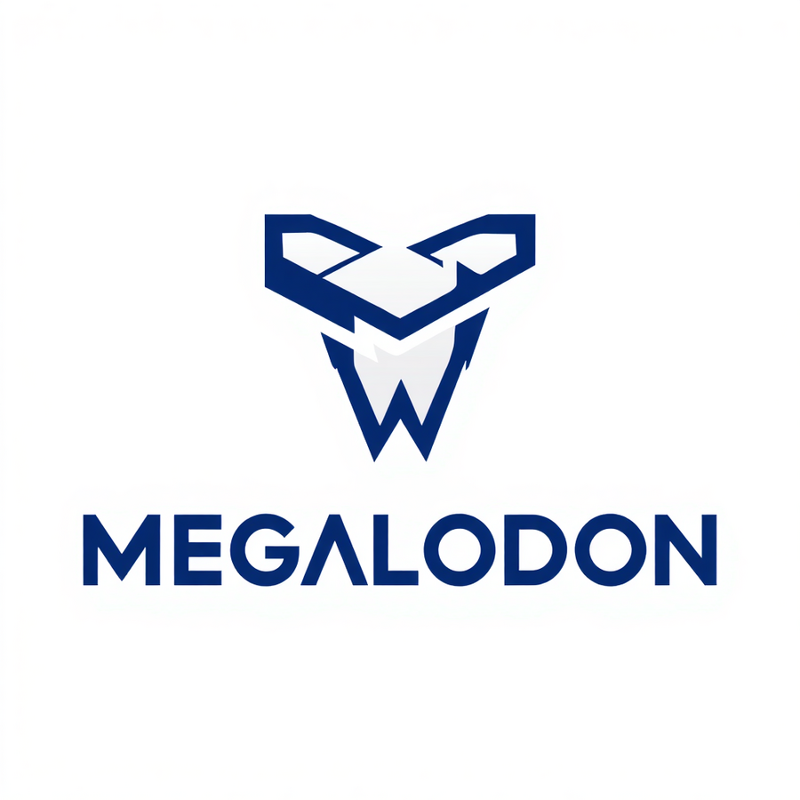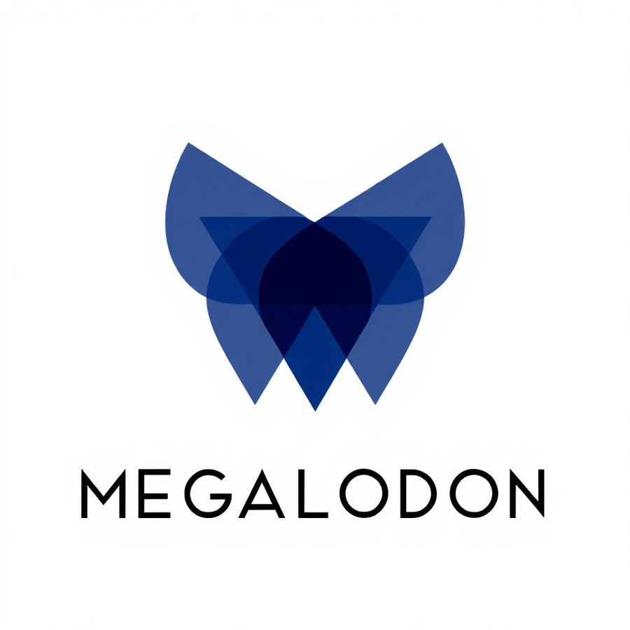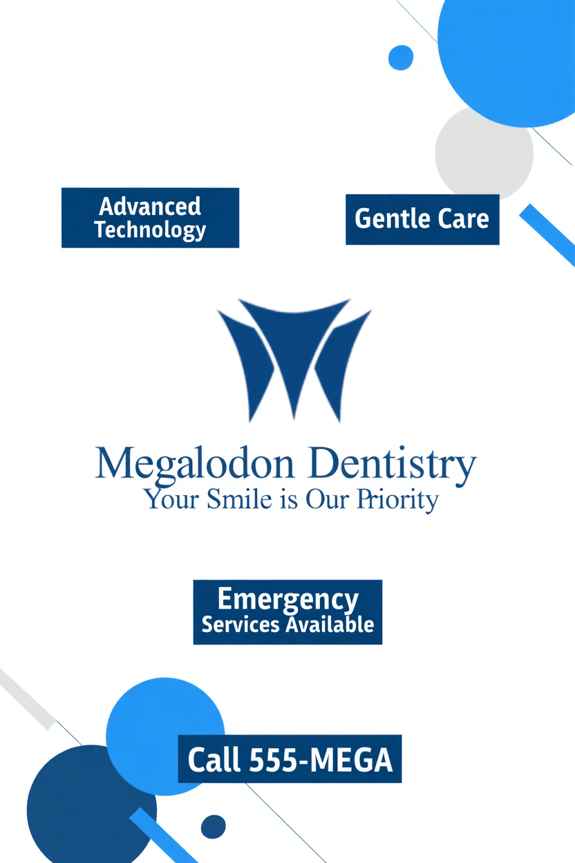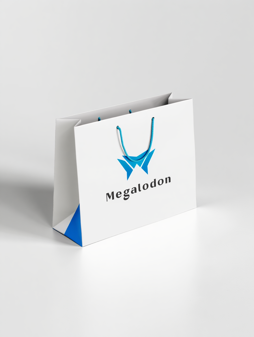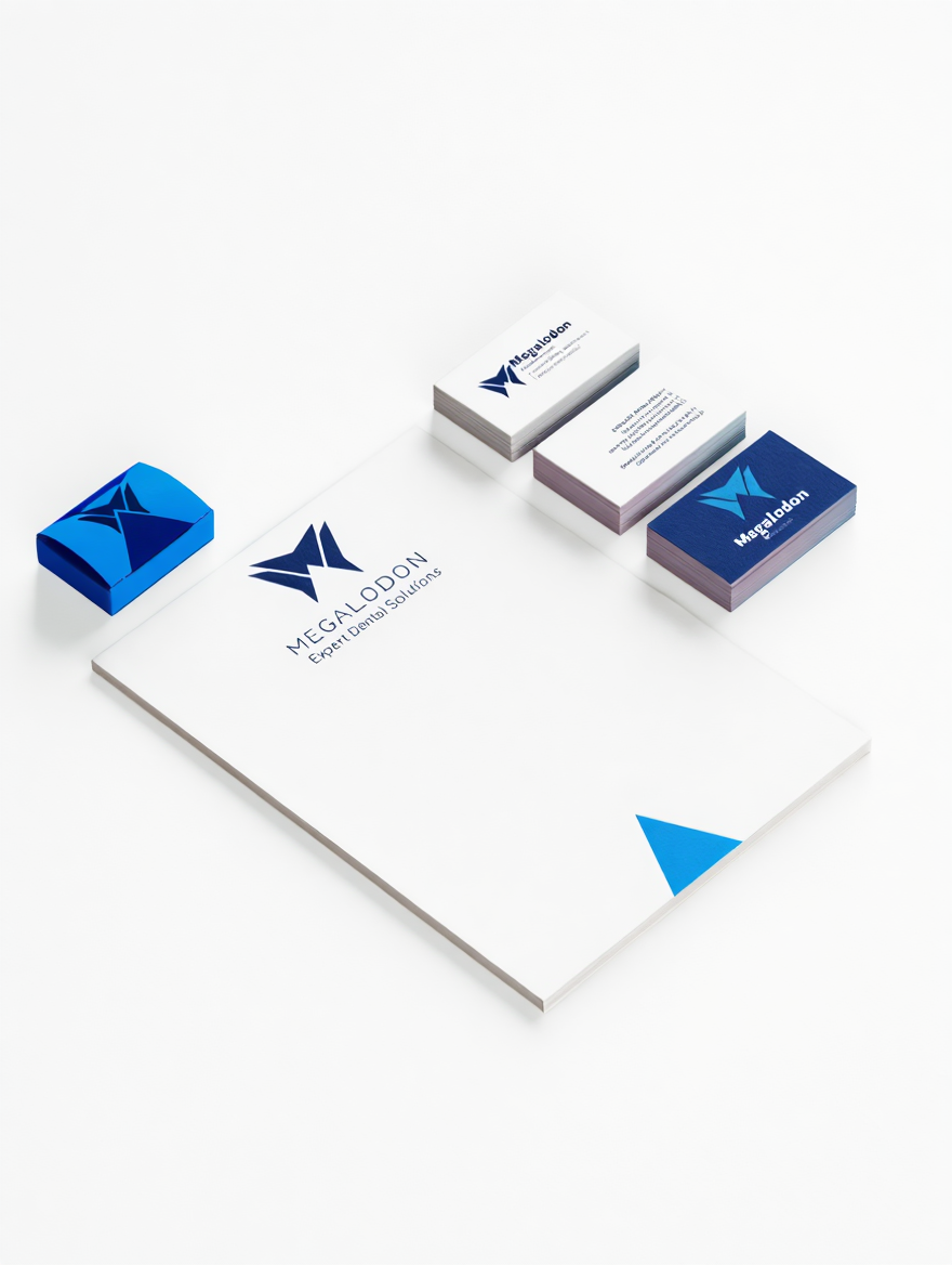 промт для бумажной продукции: Create a professional brand layout with a sleek, modern design for Megalodon, a company specializing in dental solutions. Highlight a set of stationery items, including a letterhead, business cards with a white and blue background, and a blue object with the company’s logo. The composition should emphasize a minimalist, sophisticated aesthetic on a bright white background.