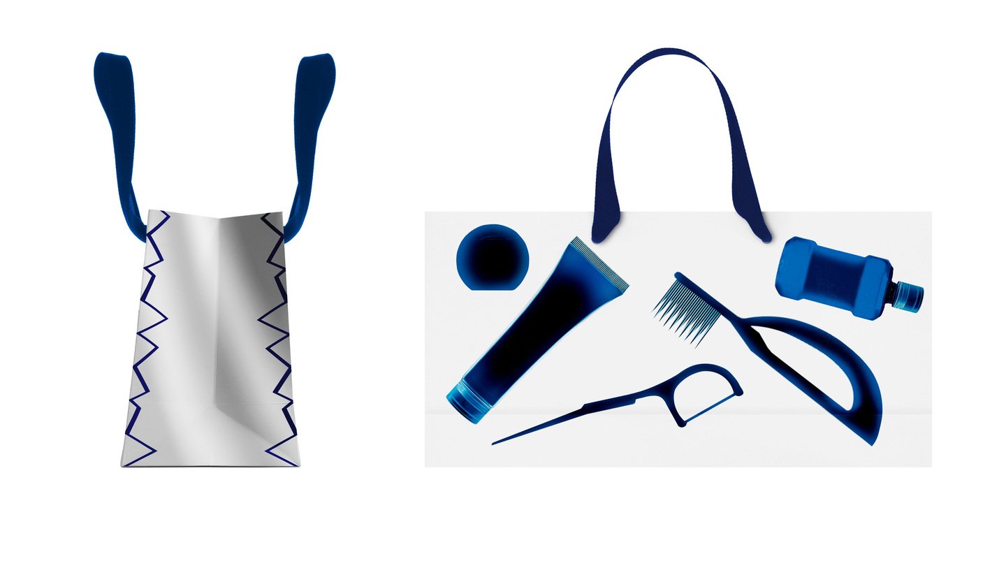 промт для пакета: Create an image of a stylish branded white shopping bag with blue accents, featuring the logo and name on a white background