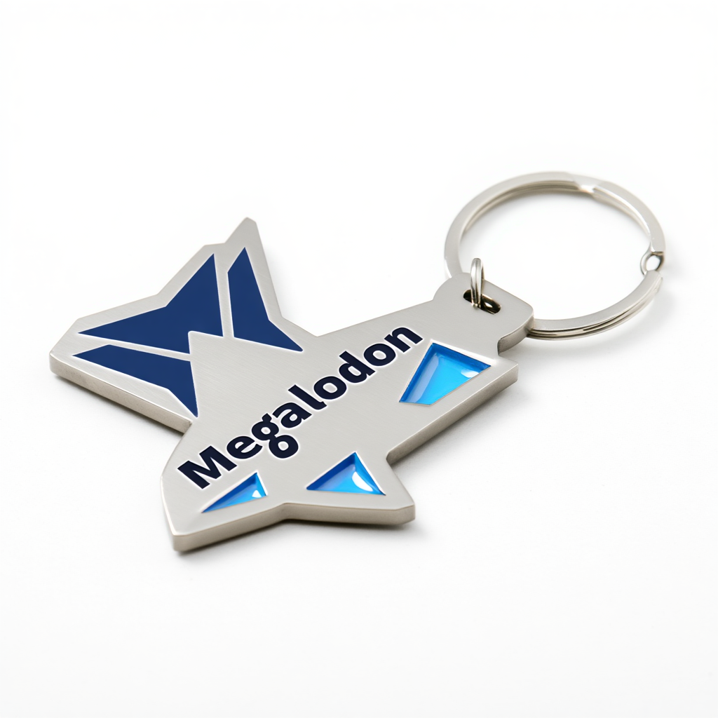 промт для брелка: Create an iron keychain for this brand in the shape of a shark on a white background.