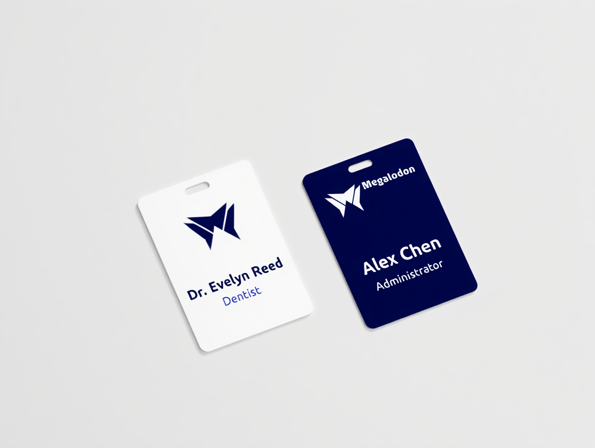 промт для бейджей: Create two badges for the dentist and the receptionist at this dental clinic, one badge should be white and the other should be blue. The items should be placed on a white background.