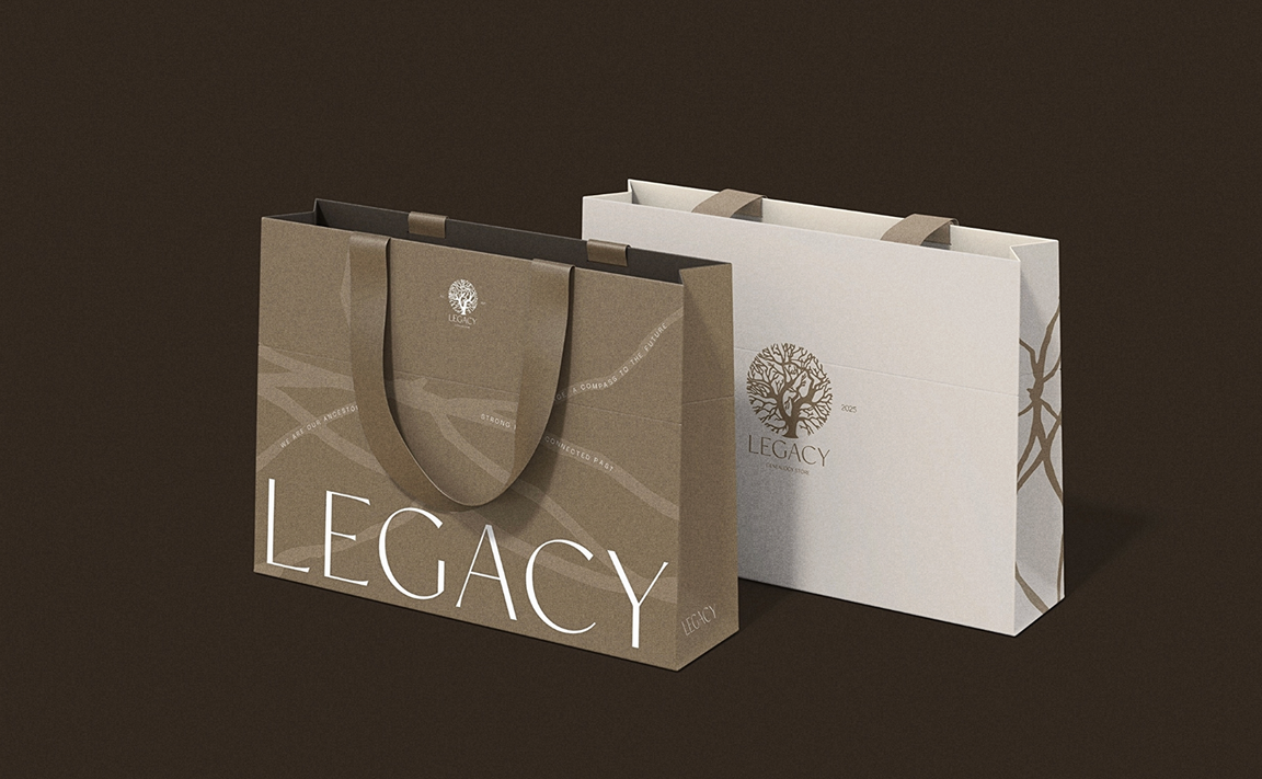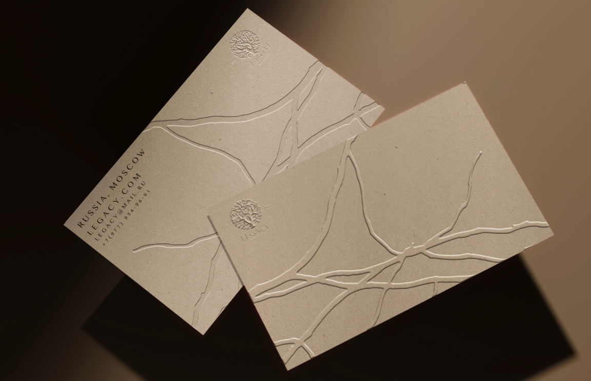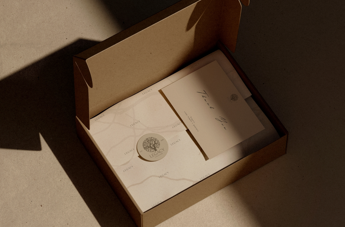 Logo: Write the inscription Legacy on a dark background. The inscription Legacy should be in gold letters and using the kensugi method. Boxes/packaging: The image depicts three brown cardboard boxes sitting on a table with a marble top. The boxes are identical in design and size, with a small logo and the inscription «LEGACY» on the front. On the side of each box is the inscription «Echoes of the past live in you.» The boxes feature lisin elements in the form of gold lines embossed on the box itself and intertwined with each other. The boxes are placed on a table. The table is located in the corner of a room with a visible brick or stone ceiling. The image appears realistic; it may be a photograph. The atmosphere of calm and elegance in the image is enhanced by the simple design of the boxes and the marble surface of the table. The exact time of day is day. Business cards: The photograph depicts a stack of business cards in the center. The rectangular cards feature a two-tone design: white and beige, connected by gold lines. The cards feature the text «LEGACY» printed in a bold, sans-serif font. The cards are gently fanned out, creating a sense of depth. The cards and box are illuminated by a warm, sunlit spotlight, softly illuminating the surface and casting subtle shadows. The image is shot at a slight angle, giving a clear view of the cards and box. The color palette is earthy, with brown and white tones predominating. The background is dark brown. The atmosphere is formal and businesslike. The image showcases a minimalist design aesthetic.