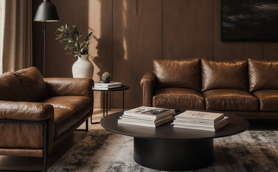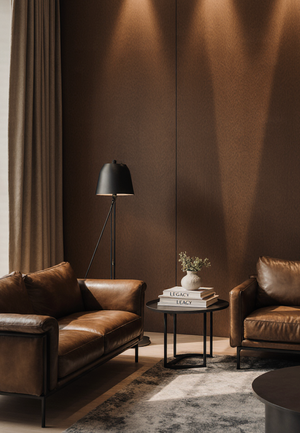 Office interior: The image shows the interior of a room decorated in warm brown and khaki tones. Along the back wall are vertical wood panels, lit from above by three spotlights. The edge of a beige curtain is visible on the left. On the wall to the right is a large painting in a black frame with the inscription «LEGACY» written on it. The room contains two light brown leather sofas. To the left of one of the sofas is a black floor lamp and a small round table with a small plant. In front of the sofas is a gray textured rug. In the center of the room is a round dark coffee table with various vintage magazines and journals with the inscription «LEGACY» on it.