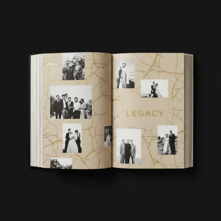 Books: The photograph shows two books stacked on top of each other. Both books are hardback, covered in a beige-brown fabric, possibly linen or canvas. The top book is decorated with a kensuki design—gold lines that I attached and a logo with the word «LEGACY» at the top. The white pages of the top book contrast with the beige cover. Soft, diffused lighting in the photograph creates a calm and warm atmosphere. The background is a solid dark brown, drawing attention to the books. The overall look of the photograph is minimalist and elegant.