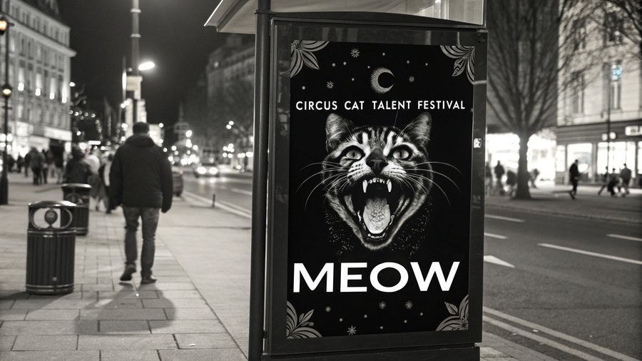 /image prompt: generate a black and white billboard on the street for the circus cat talent festival with the name «MEOW» inspired by feline fangs. The billboard should be located near the circus tent. The billboard should attract the attention of cats Нейросеть: Recraft Ai. Логотип заменён на имеющийся в Photoshop.