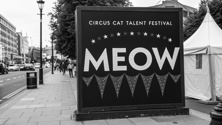 /image prompt: create a black billboard for the Circus Cats Talent Festival with the name «MEOW» inspired by cat fangs. The billboard should be located on the street near the circus tent. The billboard should attract the attention of cats. Нейросеть: Recraft Ai. Плакат полностью сгенерирован нейросетью. Логотип наложен нейросетью.