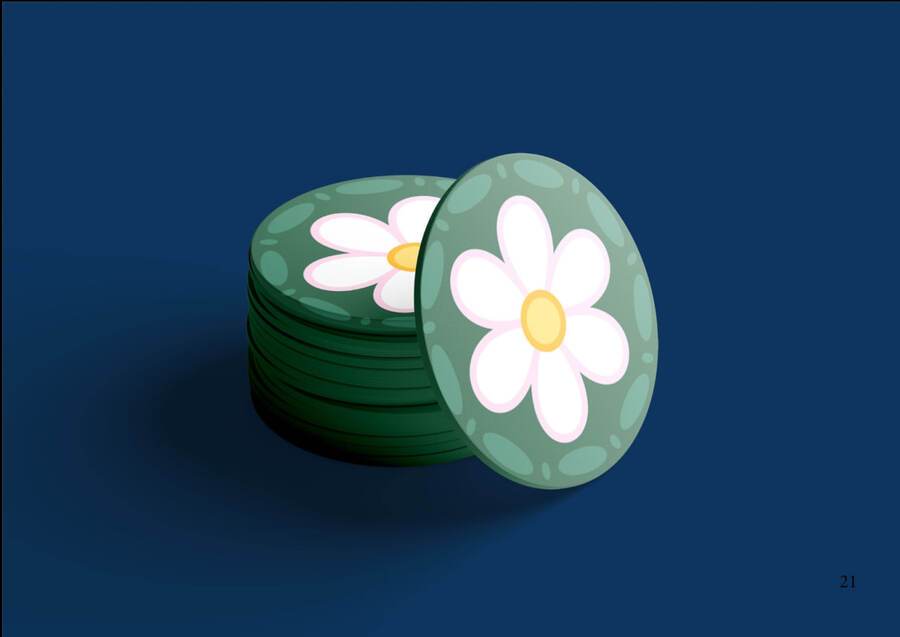 create a photo of unique round wooden playing chips scattered on a dark oak table. The chips can feature 4 minimalist designs: an acorn, a daisy-shaped flower, a tree leaf, and a mushroom. The style is cottage core, with warm colors
