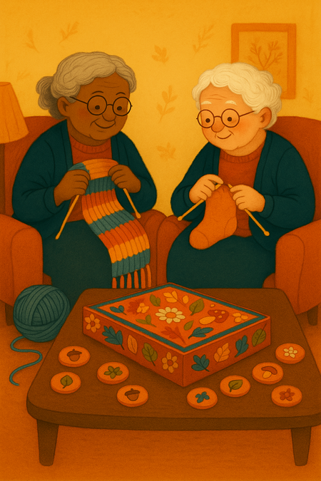Take a photo of a box for a board game about grandmothers who love to knit. Use orange as the main color and blue as the accent color. The box have a pattern with trea leaves, mushrooms, chamomile flower and acorn. Warm colors, orange as the main color, dark blue as an accent color. Cottage core and autumn aestetics. The background picture shows a dark oak table and a ball of red yarn that has unraveled.