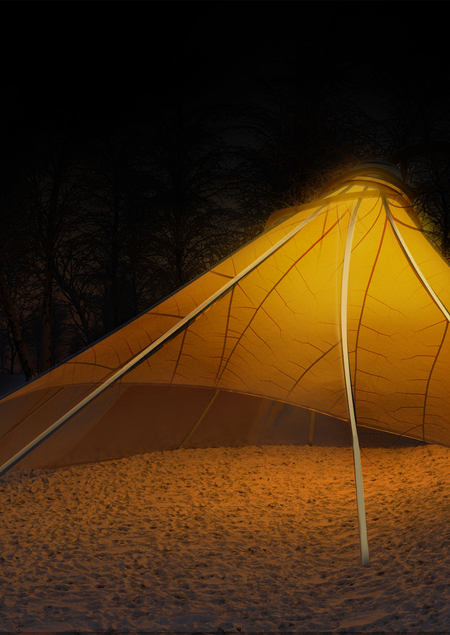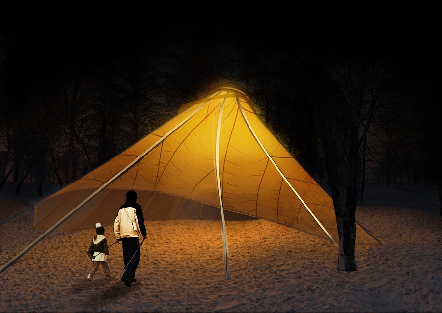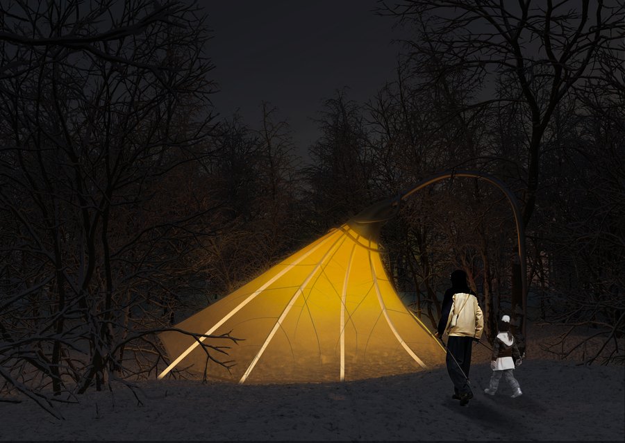 Световая инсталляция в виде цветка, создающая ощущение уюта, безопасности и тепла посреди холодного леса.