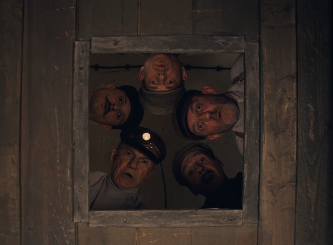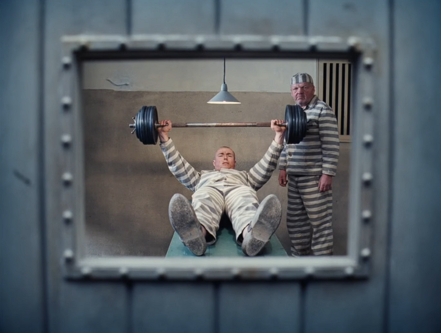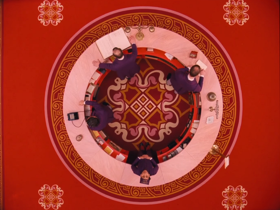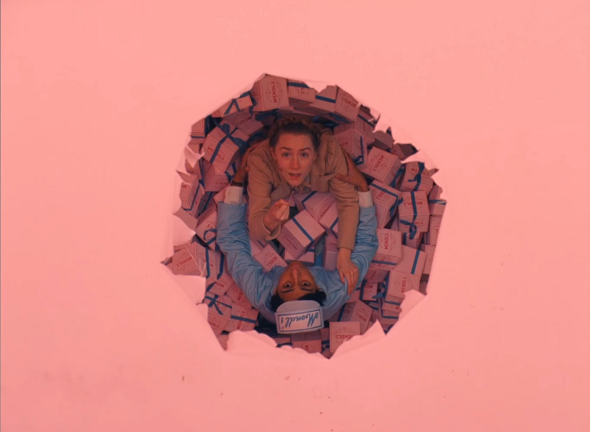 Мы также видим, как ограниченная цветовая палитра играет важную роль. Все выбранные цвета присутствуют в кадре с одинаковой насыщенностью. Становятся наиболее контрастными в отношении друг друга. Красные элементы на форме сотрудников, буквально, сливаются со стенами. Персонажей не окружают, не разбавленные белым, ни черным цвета. Это безусловно создает эффект искусственность и противоречит идеи реализма, в жизни мы вряд-ли увидим такую цветовую ситуацию. Это подчеркивает искаженное восприятие мира в который нам позволили заглянуть.