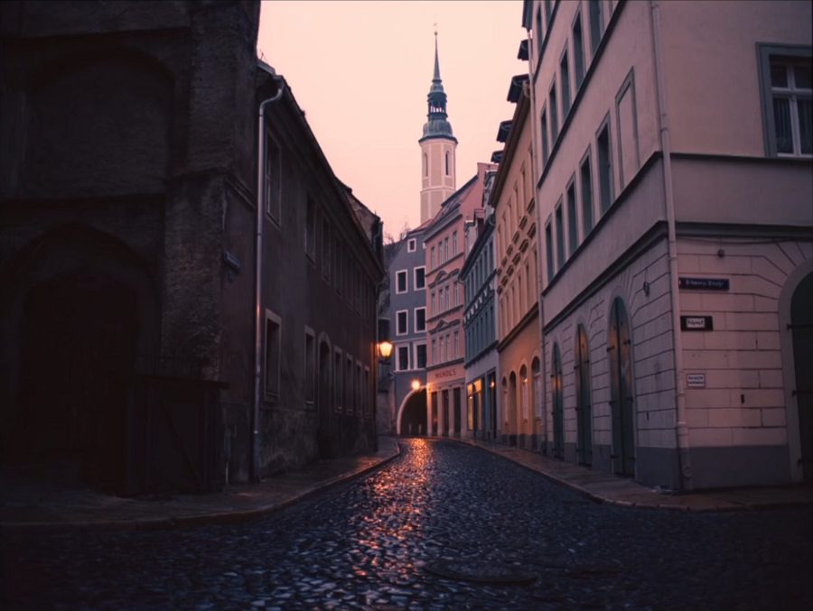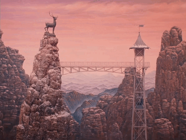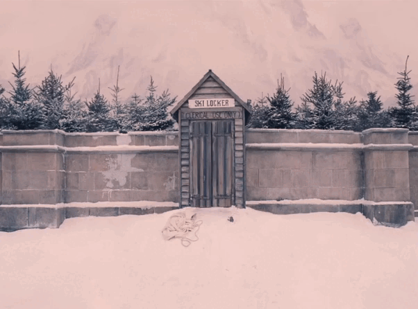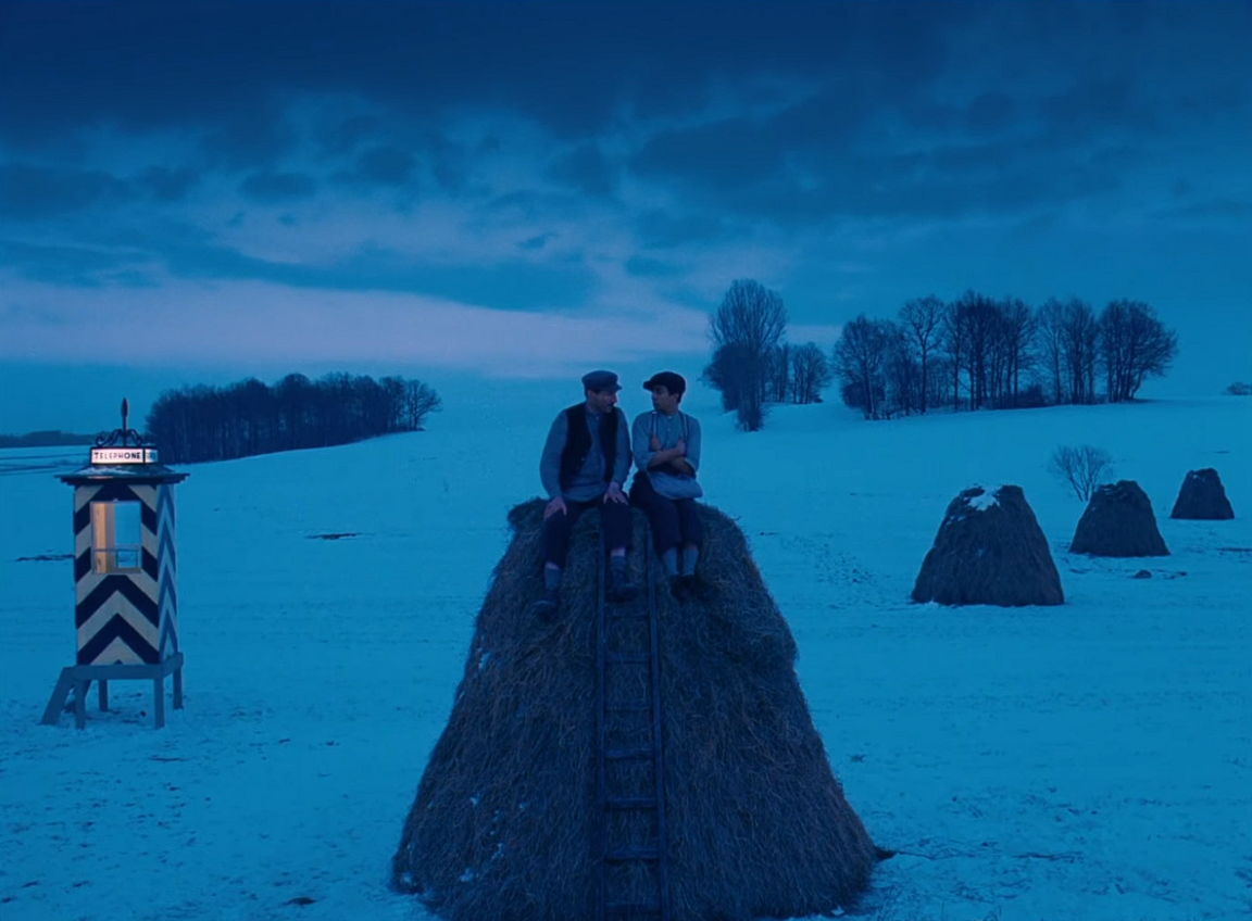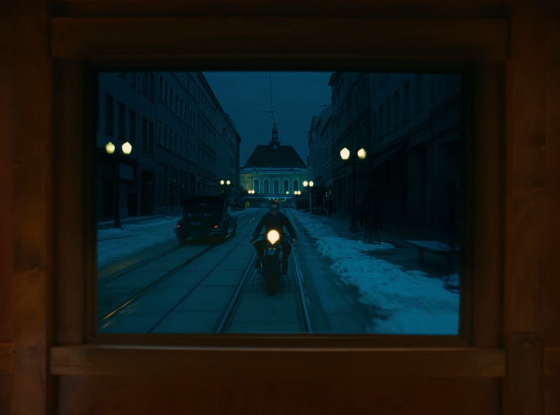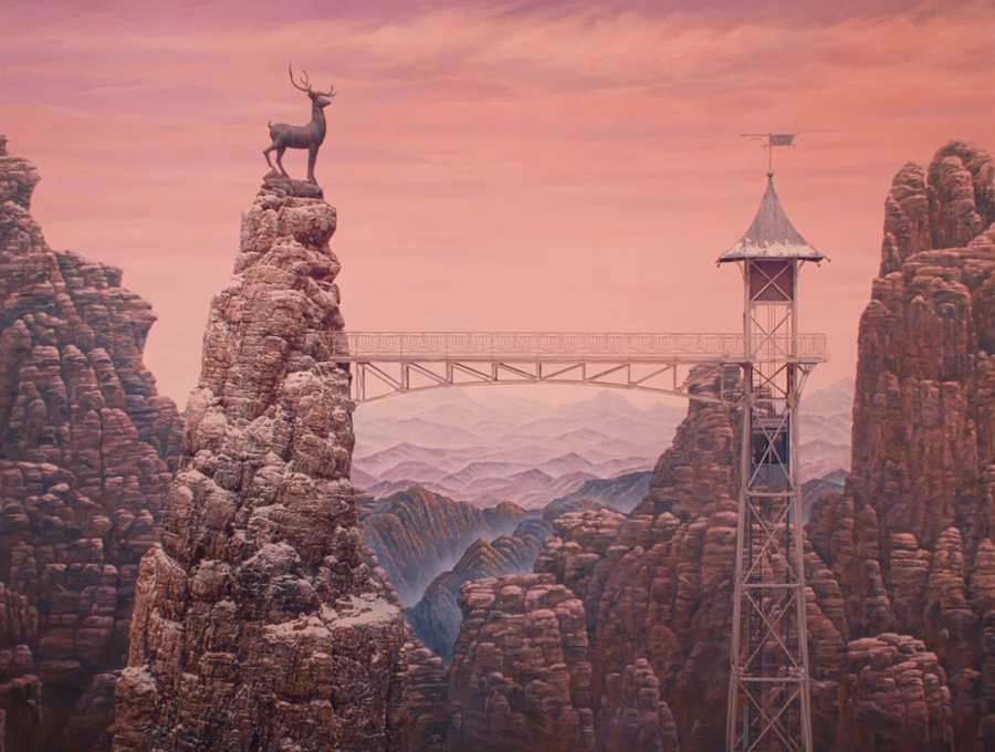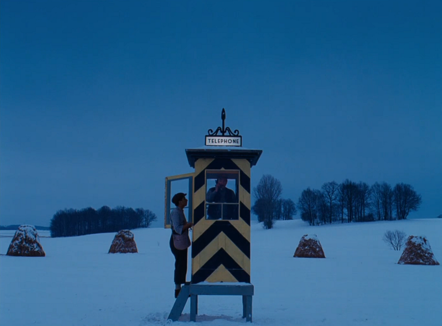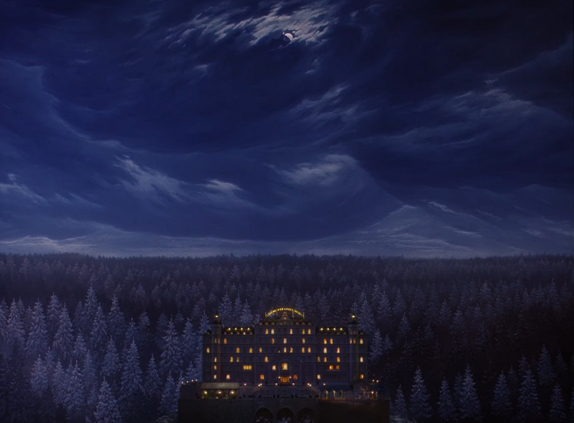 Если мы взглянем на кадры с отелем «Гранд Будапешт» или на городские улицы, на снежные просторы, становится очевидно — это абсолютные макеты, миниатюрные игрушечные постройки. Здания не маскируют свою искусственность, а персонажи не входят в их пространства. Кадр с отелем ночью, подчеркивает плоскость мира, небо неподвижно, оно сохраняет фактуру рисунка. Не натуралистическая перспектива и честная подчёркнутая декоративность — как в театральной сценографии или живописной композиции, где глубина создаётся расположением плоскостей и их ритмом.