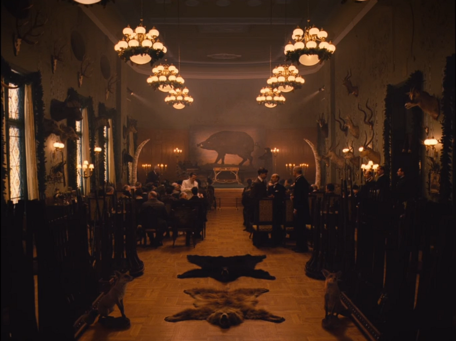 В начале фильма доминируют теплые розовые, фиолетовые и красные оттенки, создавая атмосферу утерянного мира до войны, где царили роскошь, порядок и безупречные манеры. Эти цвета ассоциируются с идеализированной Европой, напоминающей времена, когда аристократия была на пике своего могущества. К концу фильма мир погружает в желтые, коричневые и оранжевые цвета.
