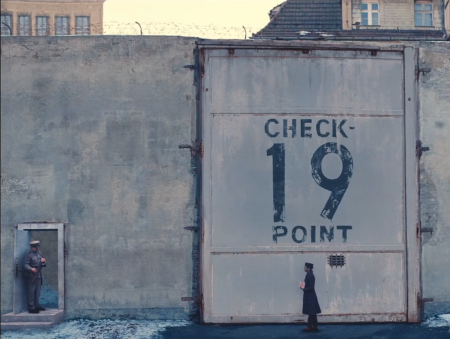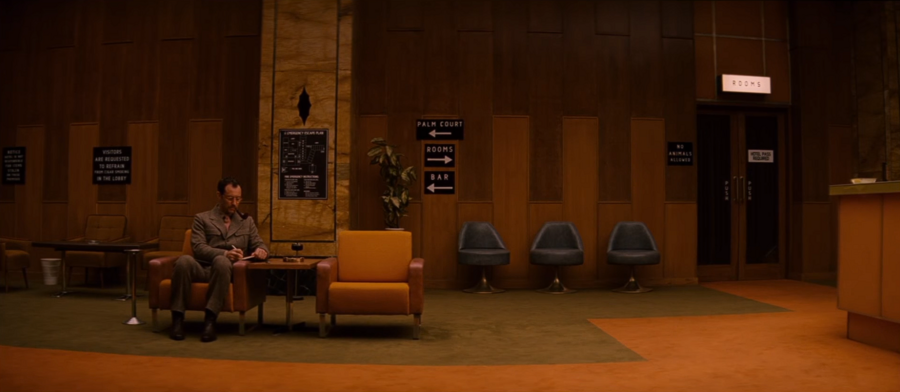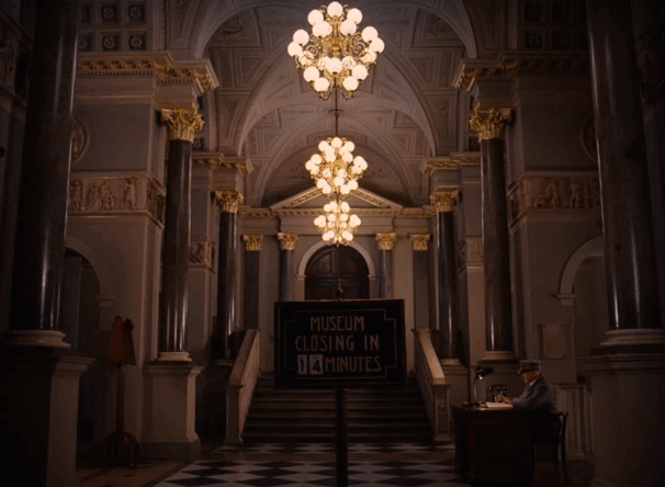 Однако в этом кадре, мы видим как герой намеренно ломает выстроенную композиционную плоскость кадра. Гюстав пересекает всю длину вестибюля и убегает по лестнице, в таком случае мы можем ощутить полную глубину пространства, вокруг героев. Использование такого неожиданного приема, для мира Уэса Андерсона приковывает значительное внимание зрителя к этому моменту сюжета. Повествование заставляет нас видеть мир глазами Зеро, этот эпизод стал поворотным в его истории, обусловлено, что этот момент выделяется ломая все устройство художественного мира.