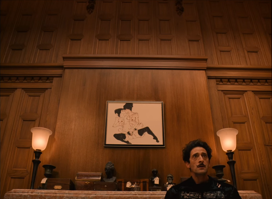 Кадр в пределах которого сложилась треугольная композиция, освещение, висящий портрет и герои образуют визуальный треугольник. Глубокая перспектива окон создает пространственную насыщенность. Кадр делится на затемненную часть и освещенную. Свет направлен сбоку, создавая мягкий контраст, теплые полутона. Сцена выстроена в подобие ритуала. Густав воспевает к искусству и его наследию. Портрет, излучающий золотой свет, предмет поклонения и переходящей власти.