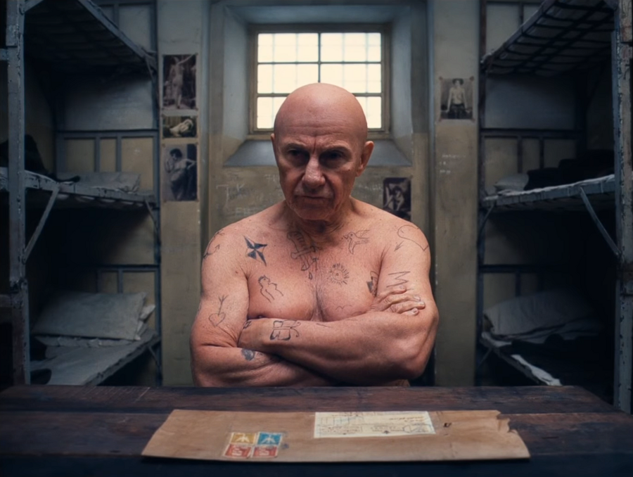 Я считаю этот кадр наиболее интересным из всех, что я представила в своем исследовании. Мы видим как стена делит кадр вертикально пополам. Складываются два разных пространства, симметрия не идеальная, а намеренно небрежная. Мебель расположенная в левой части кадра, кровать и лампа, сбалансирован по своему обьему с фигурой героя сидящего по правой вертикали. Полка со связкой ключей становится единственным полноценно симметричным объектом, что центрирует кадр. Стол обрезается краем стены, но переходит в совпадающую линию ящика у кровати, что создает ощущение разделённого, но единого пространства. Кадр сочетает в себя прямые линии и мягкие округлые формы. Светотеневой контраст также существует, более светлая правая часть, белизна, которой усиленна одеждой персонажа и левая сторона с яркими тенями. Я бы назвала симметрию данного кадра интуитивной, визуально ритмичной и уникально сбалансированной.