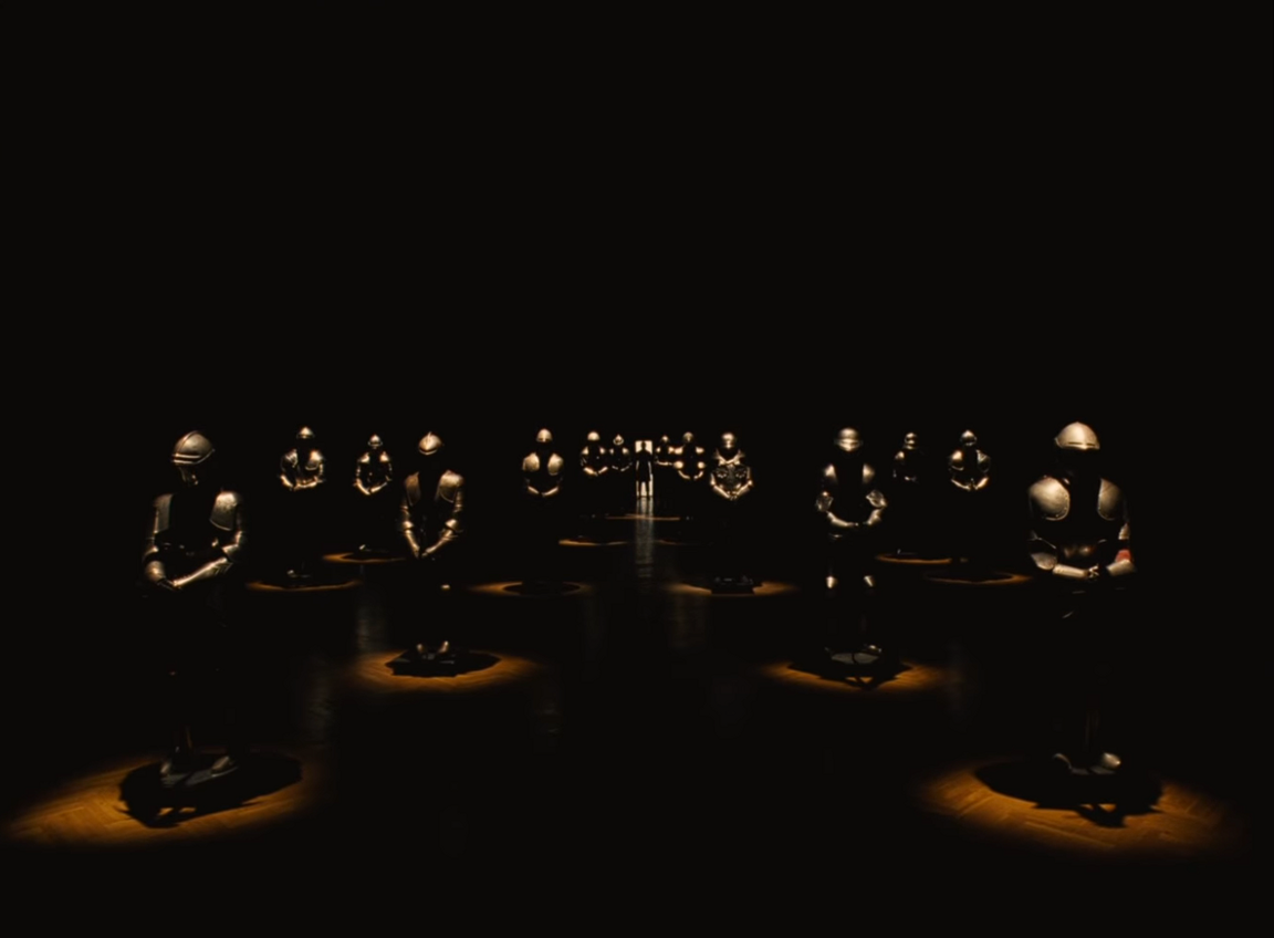 Данный кадр иллюстрируют пример использования света как активного инструмента композиции, формирующегося центры внимания и драматургию сцены. Композиция очень напоминает театральную. На кадре мы видим, перспективу уходящую вглубь. Диагонали направляют взгляд, а лестница создает центральную ось. Кадр сочетает использование теплых и холодных тонов. Сдержанные холодные цвета доминируют, но не подавляют благодаря точечному использованию теплого света, создающего эмоциональные центры. Световые акценты расположены исключительно симметрично или ритмично.
