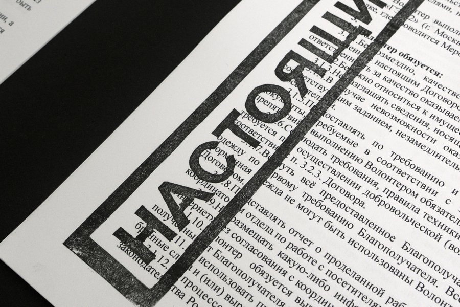 Серия представляет собой набор документов с отпечатанными на них канцеляризмами или буквально бюрократическими «штампами». Здесь я работаю с каламбурами, двойными значениями юридического языка, совмещая это с собственными документами о «безвозмездной» волонтерской деятельности, договорах о комиссии с продажи работы, согласиях на обработку персональных данных, соглашениях о неразглашении.