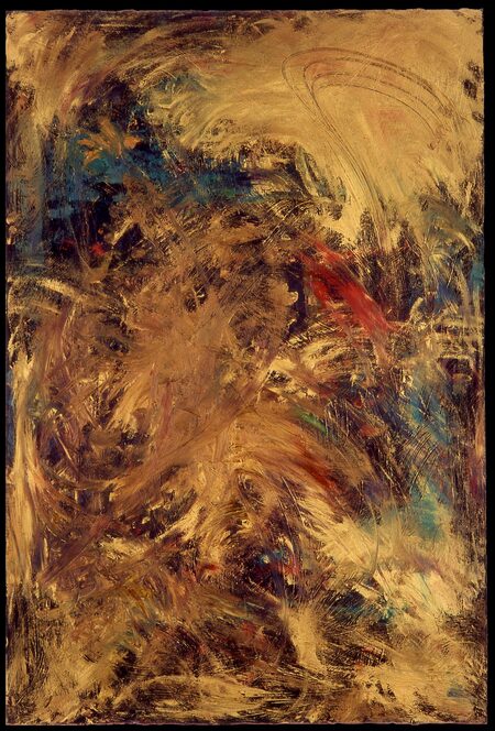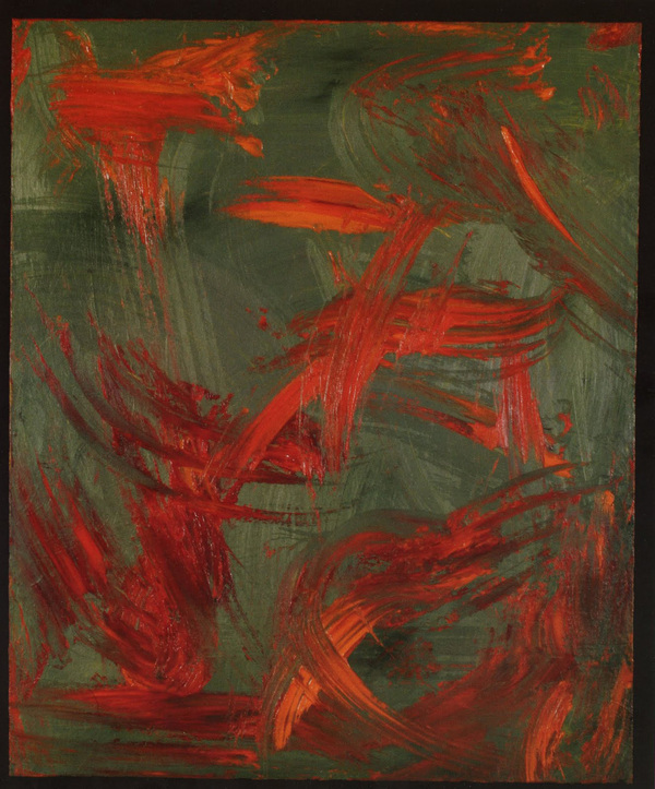 «Я написала эту картину прошлой зимой после того, как услышала, как музыкант играл на флейте сякухати… В каждой ноте, которую он исполнял, было два звука и два цвета — красный и оранжевый. Именно поэтому два цвета, которые вы видите, движутся вместе, как единая форма, на слегка металлической зеленой поверхности.»