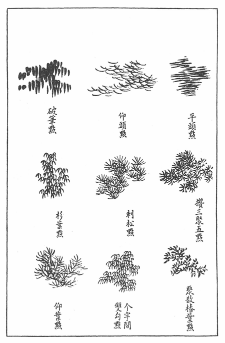 Мазок же, как энергетическое движение кисти, воспринимался не как фиксированная форма, а как след душевного импульса. С точки зрения У-син, каждый тип мазка мог символизировать элемент: Например, прерывистые линии — металл и горную реку, плавные вертикали — дерево.