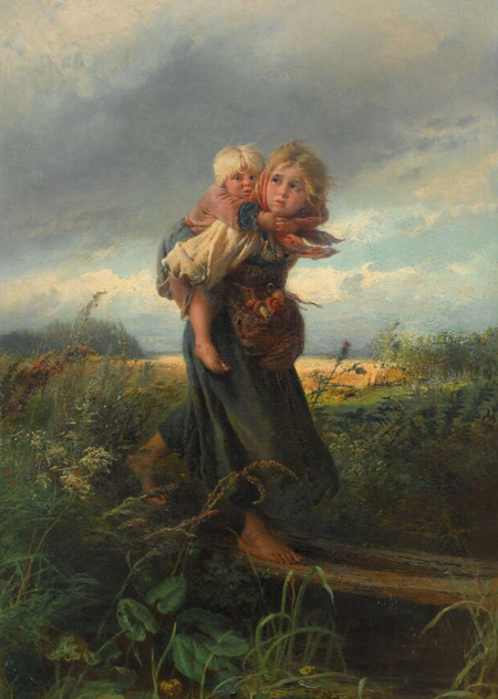На переднем плане картины изображена маленькая босоногая девочка, одетая в простой деревенский наряд, с бусами на шее, несущая на спине своего младшего брата. Наполненный фартук свидетельствует о том, что дети оказались в лесу во время сбора грибов, когда на них надвиглась гроза. Пугаясь наступающего ненастья, старшая сестра взволнованно смотрит на затемневшее небо и старается быстрее добраться до дома.