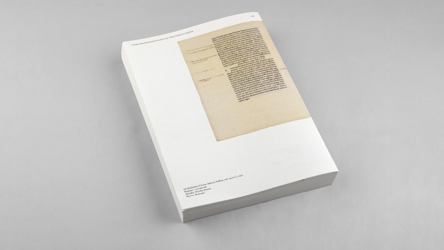 Задняя сторона обложки оформлена как и развороты с примерами, на ней находится страница из книги Ad familiares, напечатанная Николя Йенсоном.