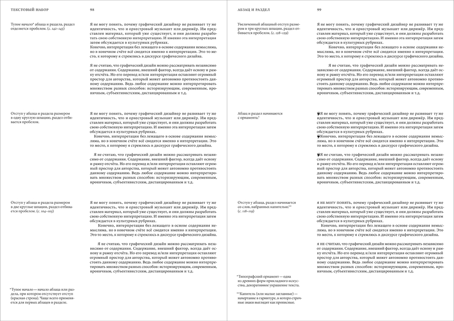 К тексту прилагаются сноски на страницы с изображениями, давая ссылку на визуальный пример. Основной текст дополнен цитатами, сноски к которым выносятся сбоку.