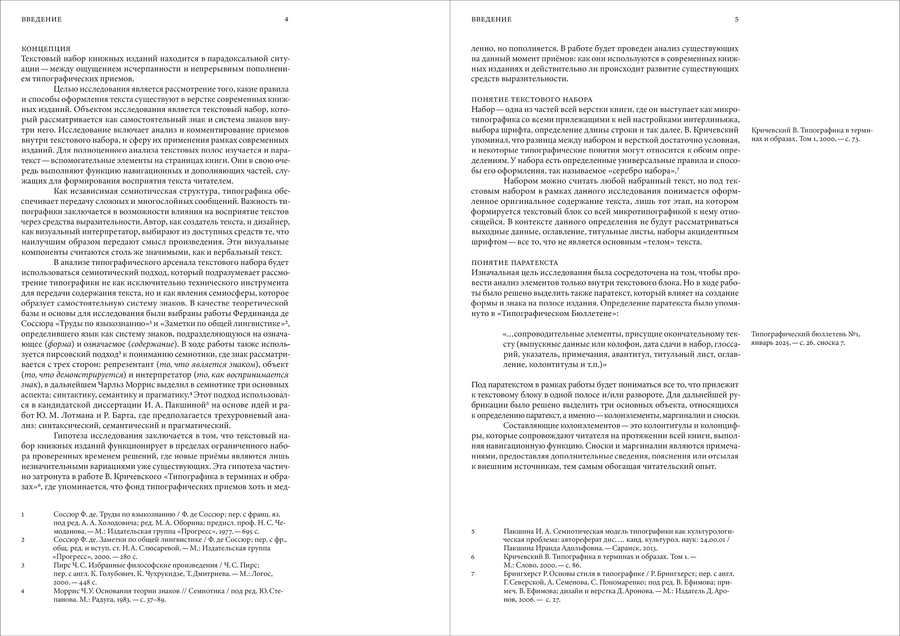 Текстовый набор книжных изданий находится в состоянии парадоксальной ситуации: между ощущением исчерпанности и непрерывным обновлением типографических приемов. Исследование направлено на изучение средств выразительности текстового набора в современных книжных изданиях.