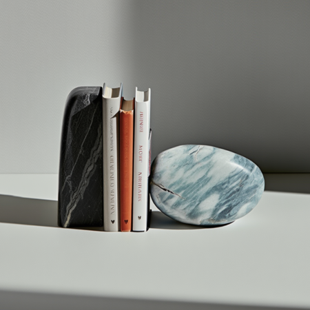 Sophisticated museum-like interior showcasing natural stone home décor. Tall ceilings, matte white plaster walls, floating shelves in warm natural wood, black metal accents. Stone sculptures spotlighted on plinths, marbled stone tables, soft gray stone flooring. Minimal furniture, sculptural seating, airy space with serene ambiance. Large windows, filtered natural light, hanging smooth stone installations, tonal monochrome palette in earthy grays and greens. Luxury wellness aesthetic, Scandinavian-Japanese fusion, calm gallery atmosphere, handcrafted textures, elevated nature-inspired retail design.