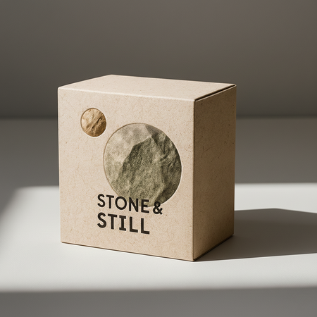 Luxury minimalist product box inspired by natural stone textures, soft matte recycled paper in warm earth-tone beige, subtle grain pattern like smooth river stone, debossed Stone & Still logo in black ink, simple text, clean geometry, no plastic, natural linen string closure, gentle shadows, premium calm lifestyle aesthetic, Japanese wabi-sabi influence, soft diffused light, editorial product packaging photography