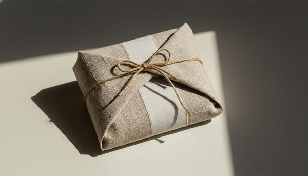 Sustainable product wrap made of kraft paper and raw linen fiber, hand-tied twine, small polished pebble tag accent, black minimalist Stone & Still logo stamp, soft organic folds, earthy palette, artisan handmade luxury, slow-living aesthetic, natural sunlight and shadows, tactile texture focus, elegant zen styling