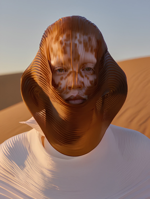 1 Интерьер футуристичного шоурума бренда VIT.OVERLAY. Биоморфная мебель, глянцевые белые и цветные поверхности, неоновая подсветка. Стилизованные манекены с фарфоровой кожей и художественными пятнами витилиго демонстрируют асимметричную одежду в стиле «техно-органик». Атмосфера космической галереи, чистота и высокие технологии. Фотреалистичный 3D рендер, кинематографичный свет. 2 Футуристические солнечные очки, асимметричный дизайн, биомимикрия, цветовой градиент «светлый песок — графитовый», матовая и глянцевая текстуры. Макросъемка, студийный свет, высокодетализированный рендер. 3 A futuristic sunscreen tube, amorphous organic form, matte beige and brown biopolymer with soft pink accents. The surface has subtle, smooth off-white spots. A sleek holographic «VIT.OVERLAY» logo glows softly above it. Soft-tech bio-design, clean lab aesthetic, photorealistic 3D render, high detail, studio lighting.