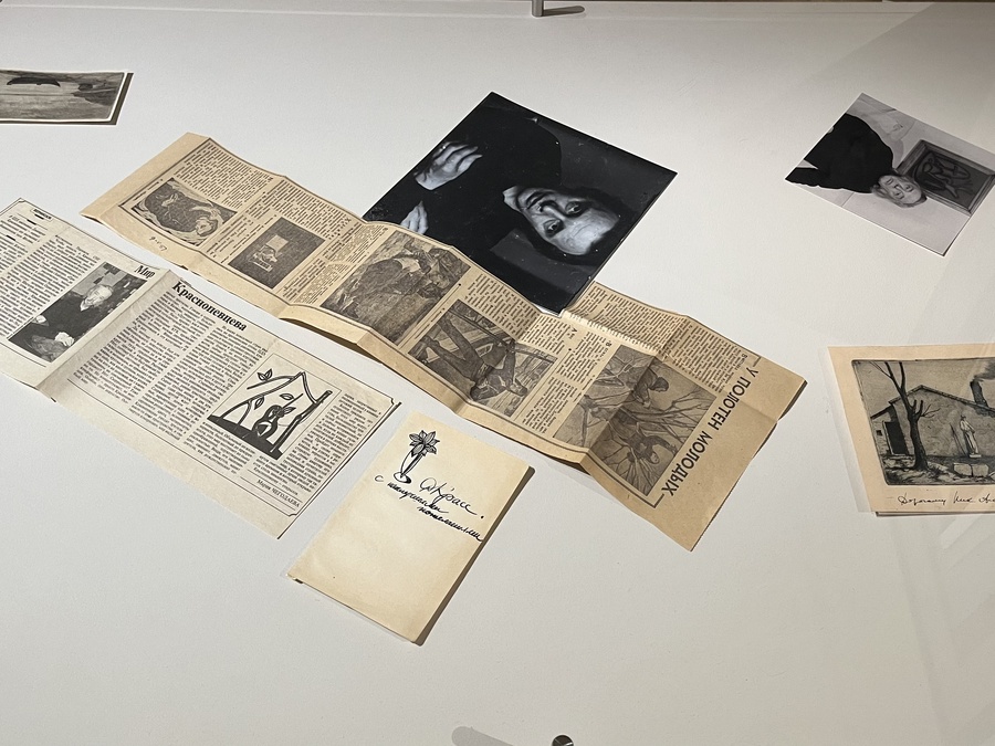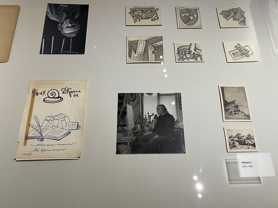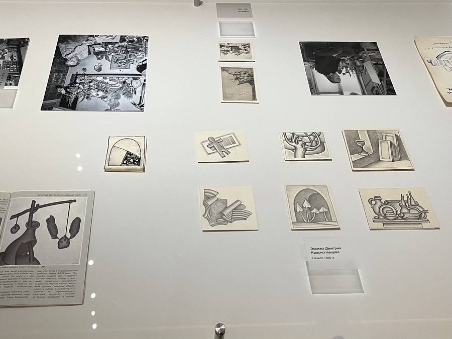 Помимо живописи и графики, в выставку были включены открытки, офорты, маленькие зарисовки и иллюстрации художника, как размышление о мире вещей. Особенное внимание уделено как бы архивной части его творчества, воплощенной в журналах, газетах, личных записях и первых каталогах Краснопевцева. Зритель мог полистать оцифрованные первые каталоги и познакомиться с личным дневником художника, прикоснуться к его мыслям физически. Повествование строится не только через работы художника, но и документальные данные, следы эпохи, что, безусловно, способствует иному восприятию автора.