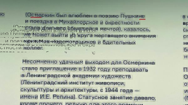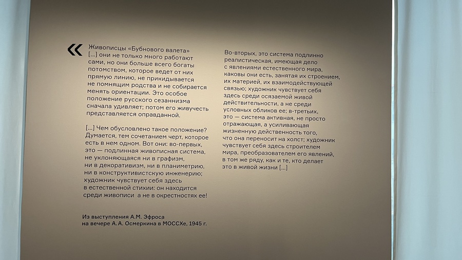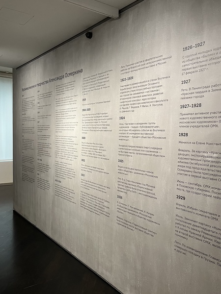 В сравнении выставка живописи Осмеркина выглядит более академичной и традиционной. На мой взгляд, выставка больше рассчитана на аудиторию знакомую с творчеством художника и совсем не способствуют заинтересованности «современного зрителя», чье внимание сложно удержать классическим подходом, использующим один медиум для повествования. Погружение в контекст создавалось за счет большого количества текста, который несомненно важен, однако довольно сильно перегружал восприятие. С технической точки зрения проект выполнен согласно концепции, которая намечалась у меня в голове, как у зрителя — создать гармоничное пространство, которое бы способствовало восприятию творчества Осмеркина.