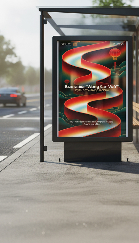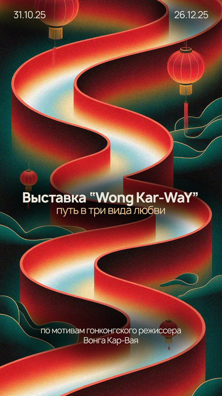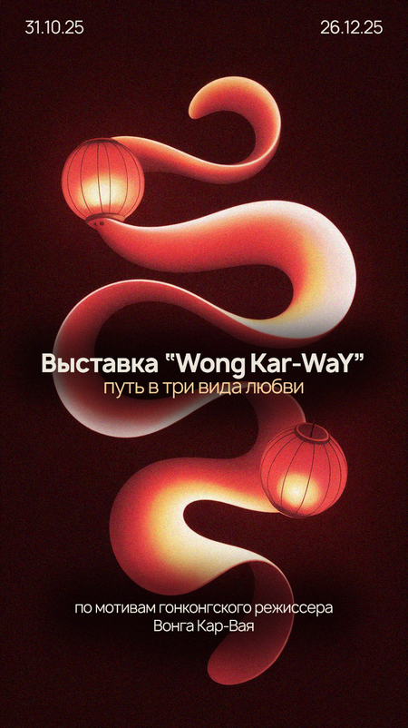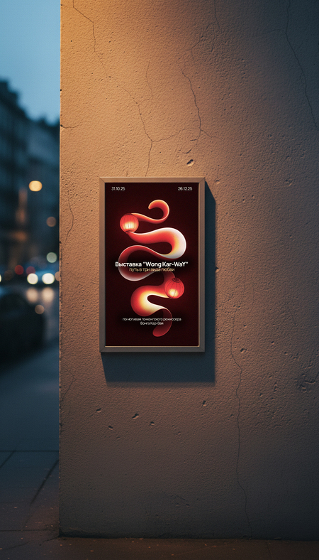 Промт: «Logo design for an immersive exhibition branding project titled „Wong Kar-WaY, ” inspired by the poetic cinematic style of Chinese director Wong Kar-wai. The logo should express the atmosphere of the exhibition spaces — glowing red light, curved luminous paths, koi-like flow, and calm architectural balance. Abstract, minimalist, and fluid — not a collage but a unified visual symbol. The form should evoke intimacy, reflection, and motion through soft gradients of deep red, gold, and white light. Incorporate subtle inspiration from red lanterns and maze-like curves without being literal. Cinematic mood, immersive art identity, contemporary museum branding aesthetic, elegant typography integrated seamlessly.“