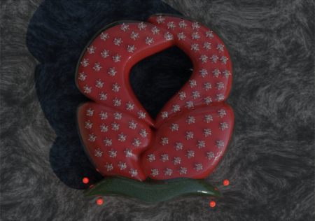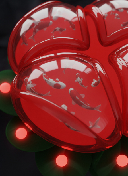 Промт: «Top view of a 3D exhibition space shaped like a red flower bud with four thick petals, modeled in Blender. Each petal is glossy, semi-transparent, and covered with small koi fish figurines inside the surface. The petals form a rounded symmetrical composition with a hollow center. The base is a green, leaf-like structure with glowing red dots around it. Background is dark, soft, and slightly textured like swirling velvet. Realistic lighting, cinematic reflections, smooth glass material, detailed koi fish pattern, rendered in ultra-high quality, artistic top-down composition.»